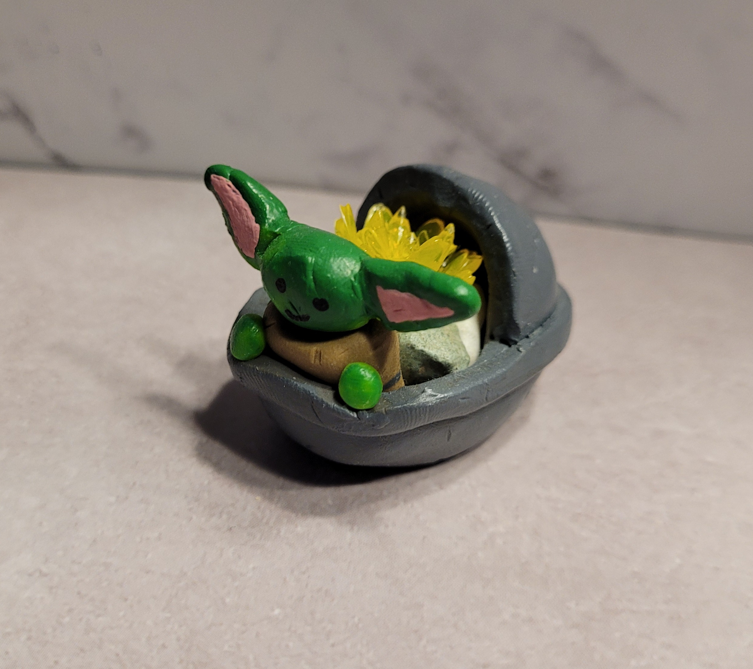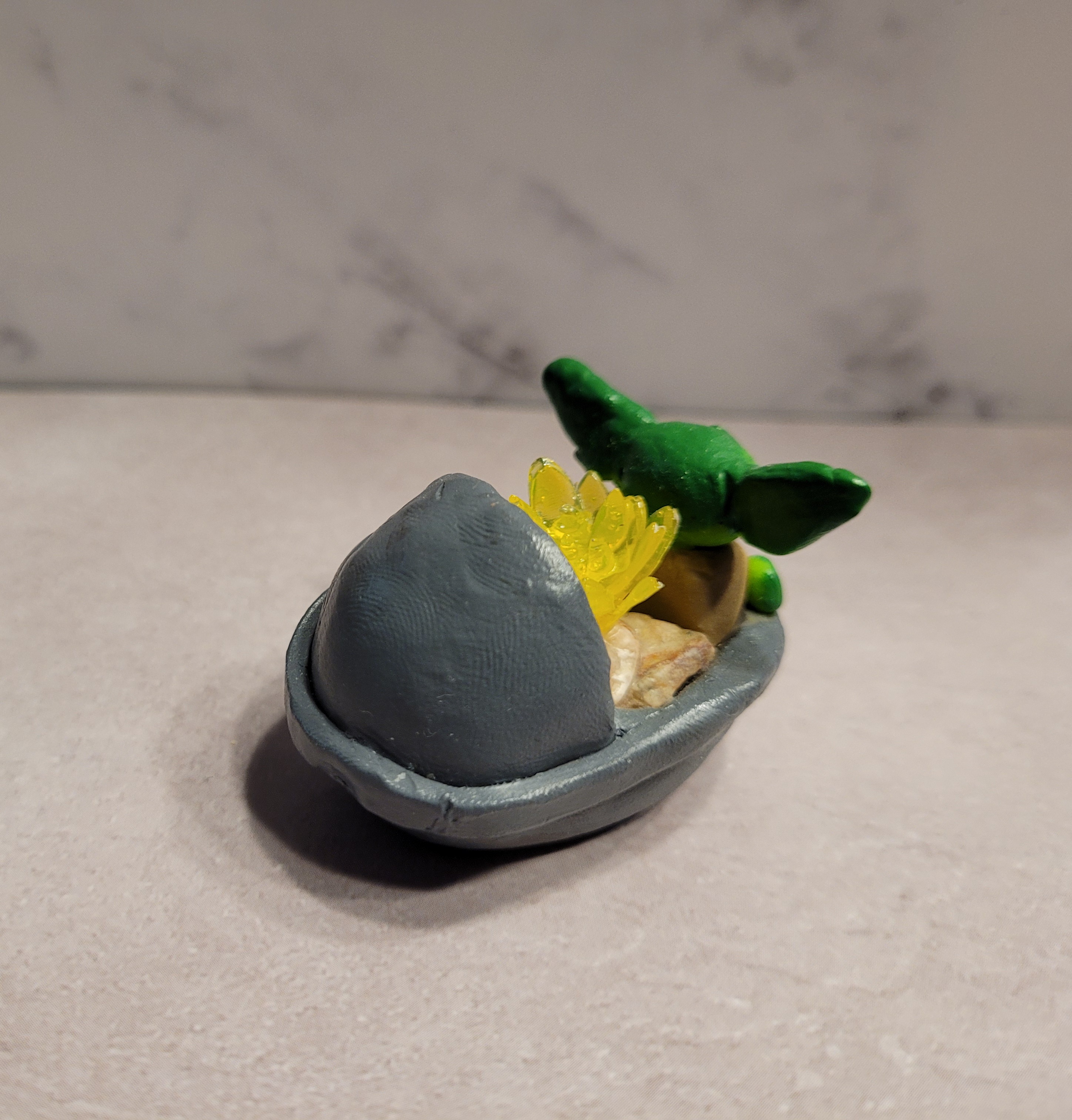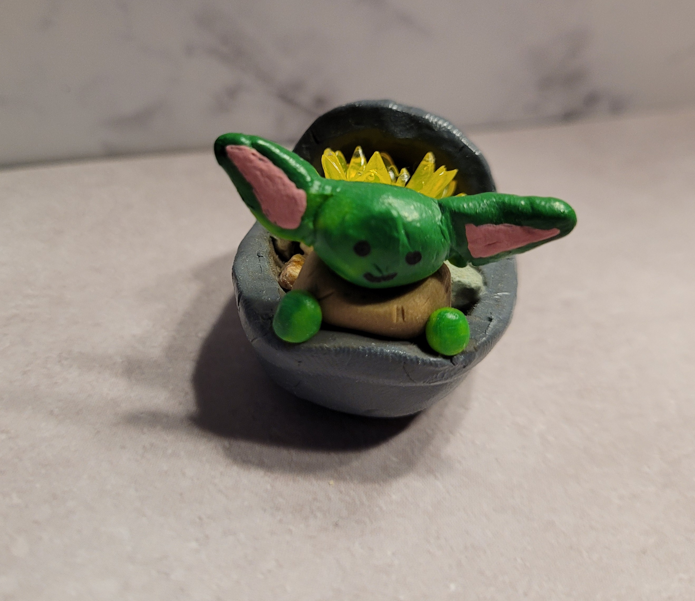 Mini faux succulent planter sculpture featuring the child in their pod. Sculpture measures 1.25in tall, 1.5in wide, and 1.75in long. Made with polymer clay, resin, stones, and acrylic paint.