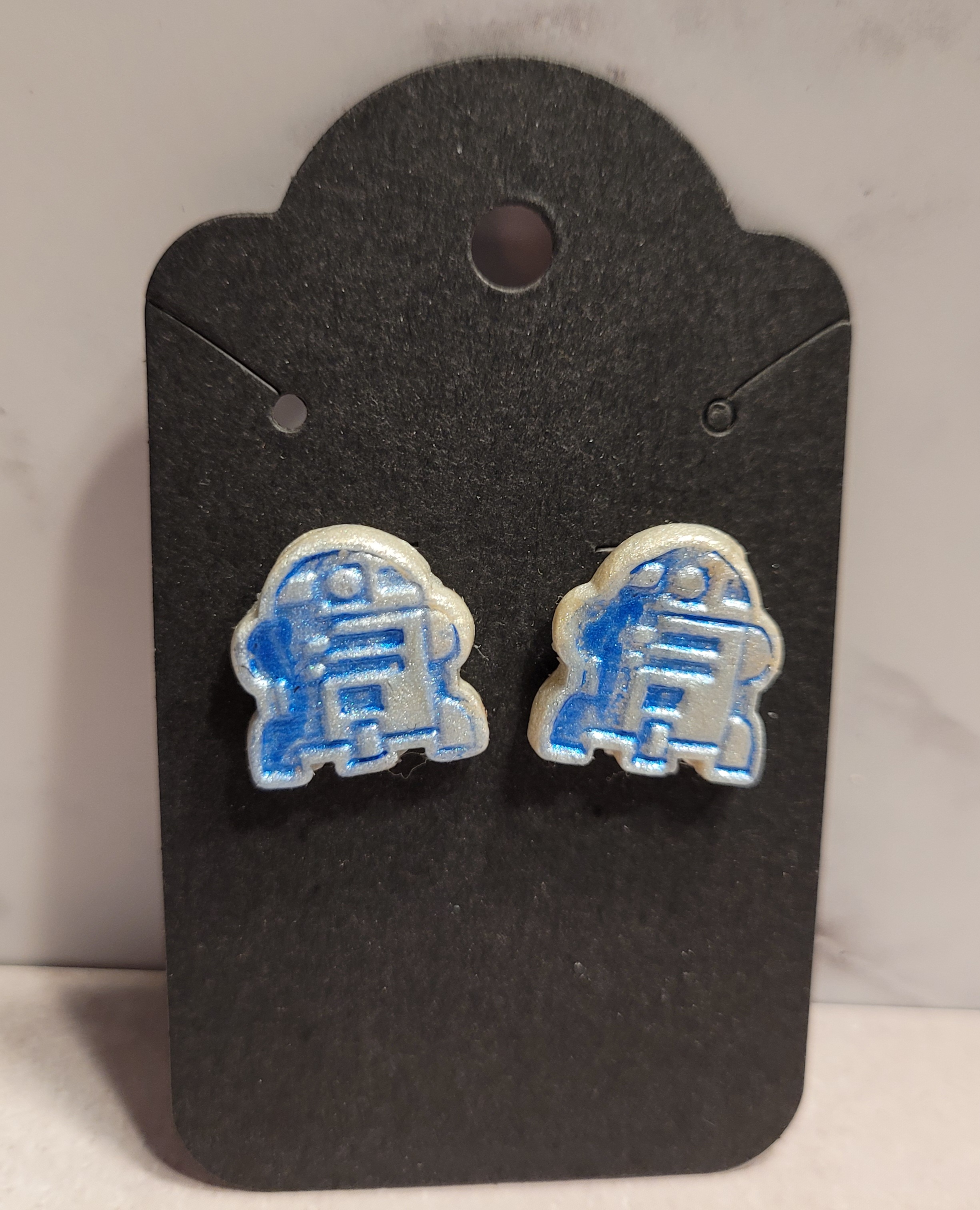 Stud earrings based on R2-D2 from Star Wars. Made with polymer clay, acrylic paint and nickel free metal findings.