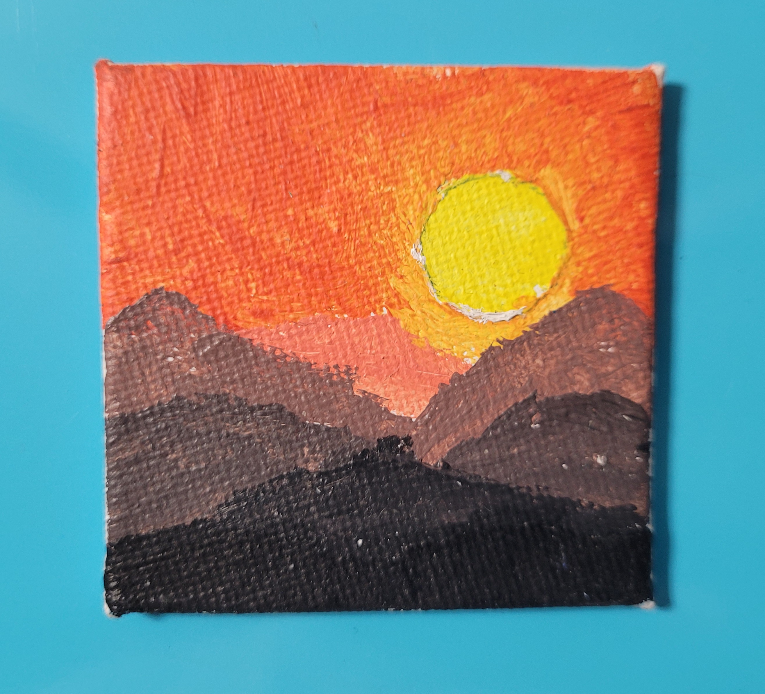 Painting of a sun setting over the mountains. Hand painted with acrylic paint on a 2x2 canvas with magnetic backing.
