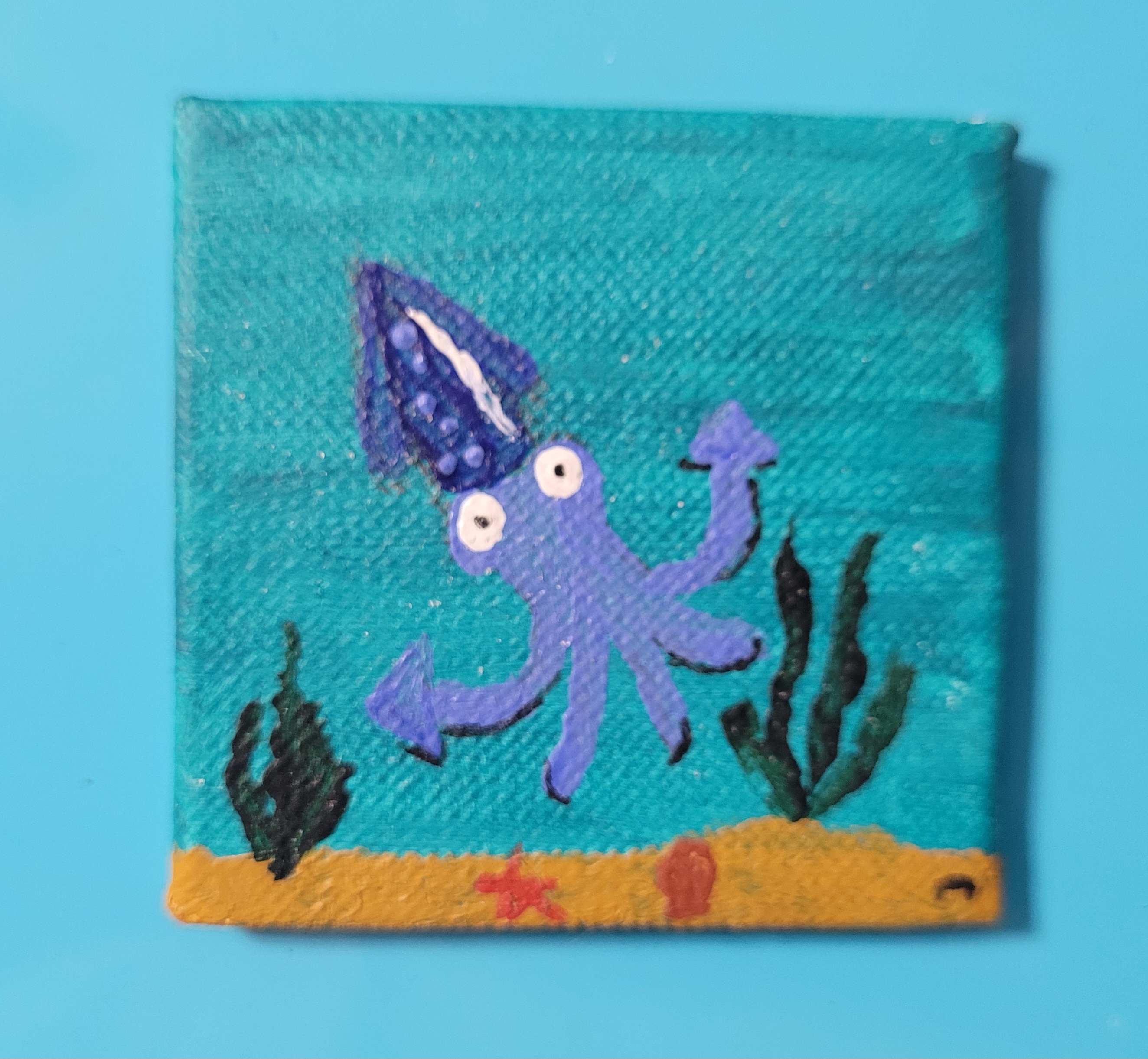 Painting of an underwater scene featuring a squid. Hand painted with acrylic paint on a 2x2 canvas with magnetic backing.
