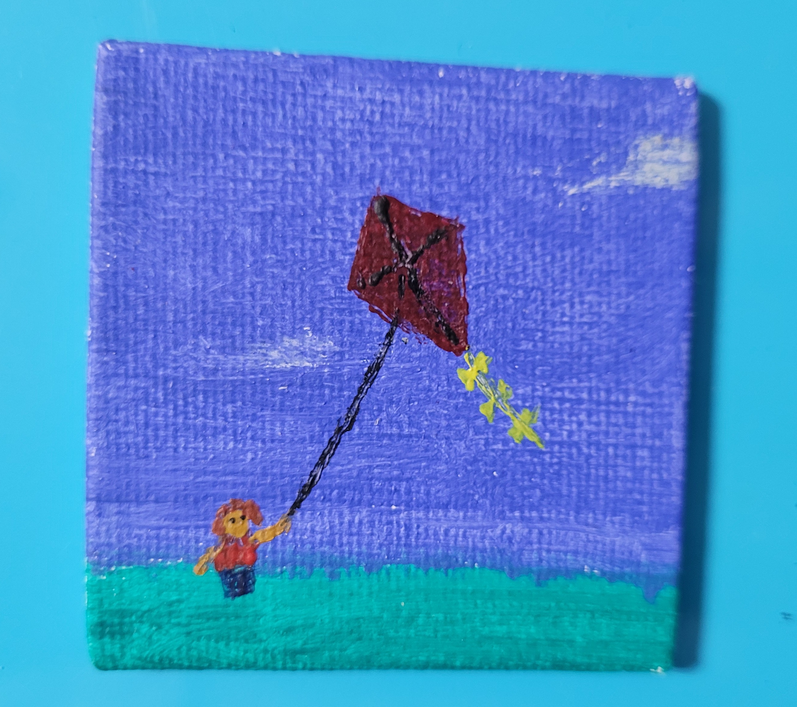 Painting of someone flying a kite. Hand painted with acrylic paint on a 2x2 canvas with magnetic backing.