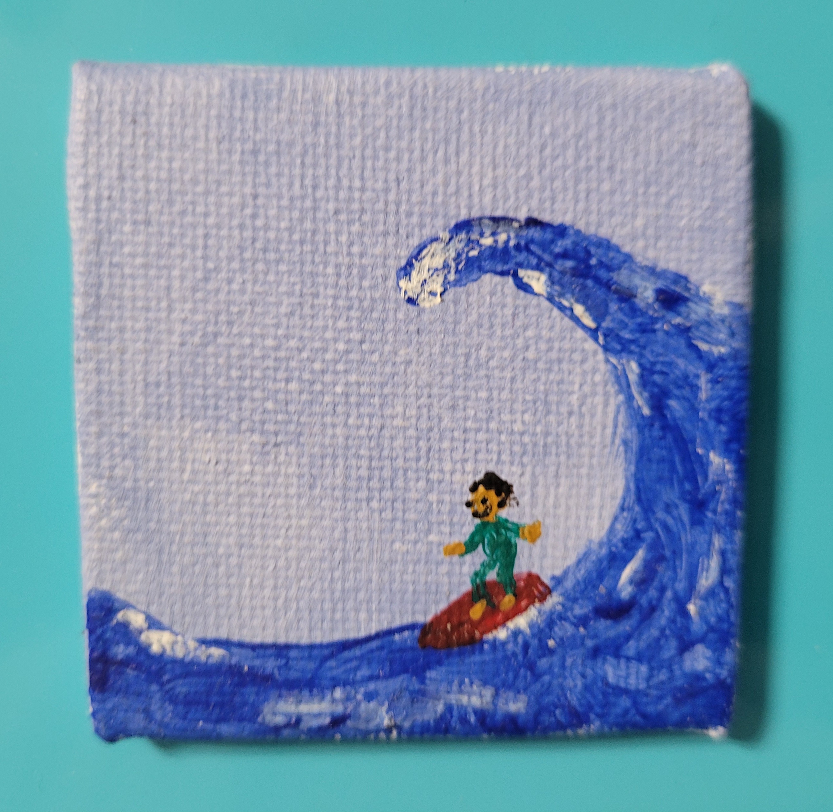 Painting of a surfing person. Hand painted with acrylic paint on a 2x2 canvas with magnetic backing.