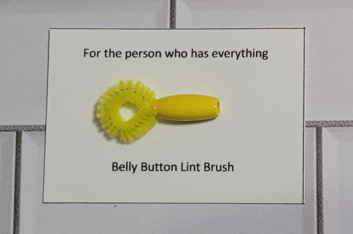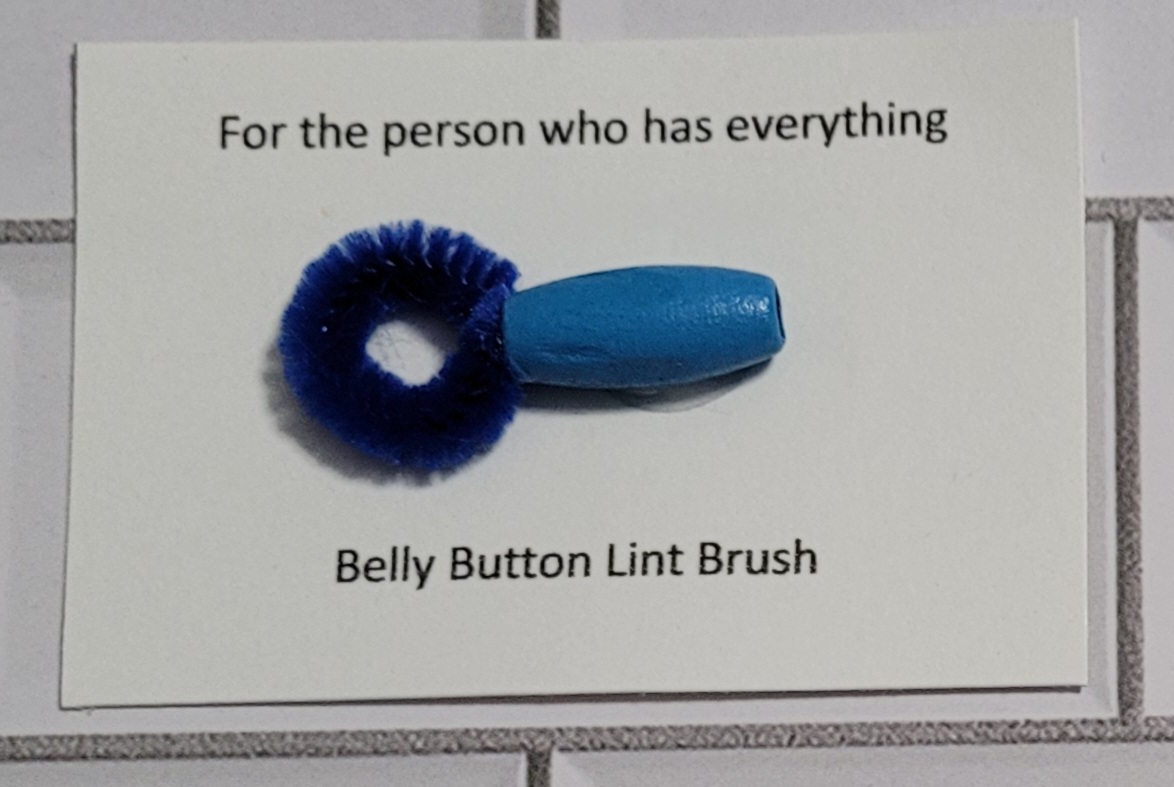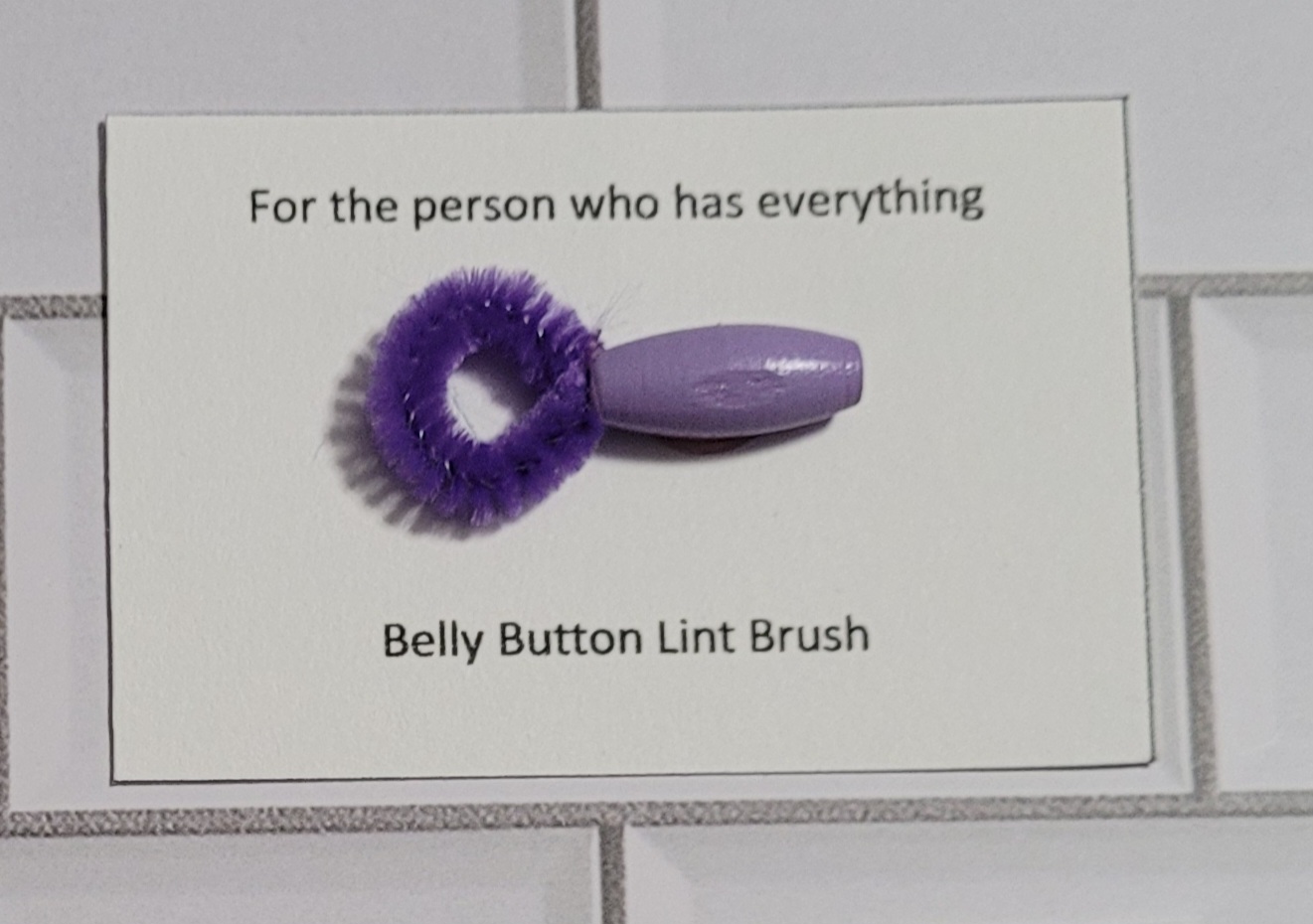Novelty gift for the person who has everything. Not for actual use, just for display purposes only. Made with chenille stems, wooden beads and mounted on cardstock label with glue dot.