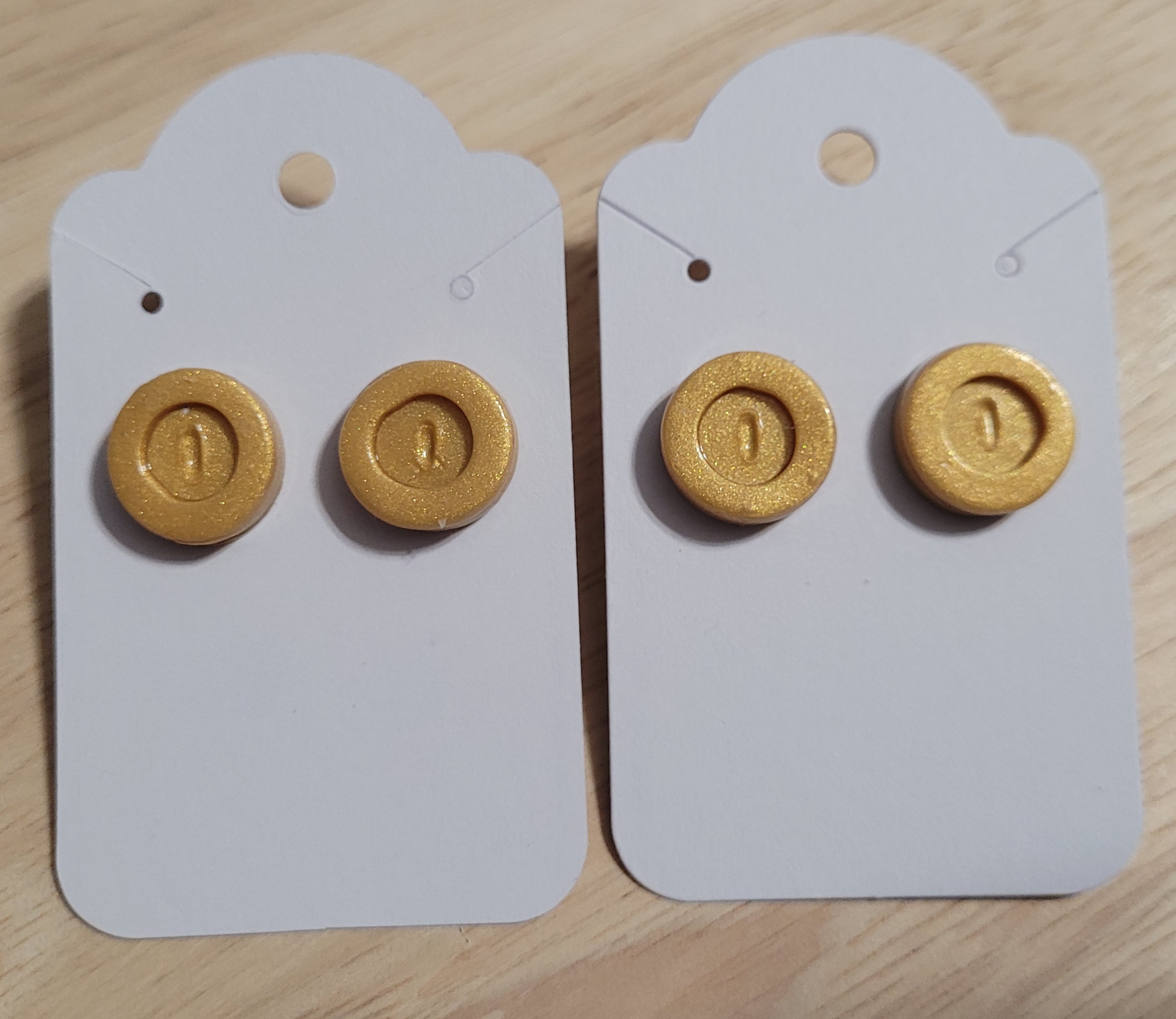Earrings inspired by the coins you collect in the popular video game series about Italian brothers. Made with polymer clay, nickel free metal findings and e6000.