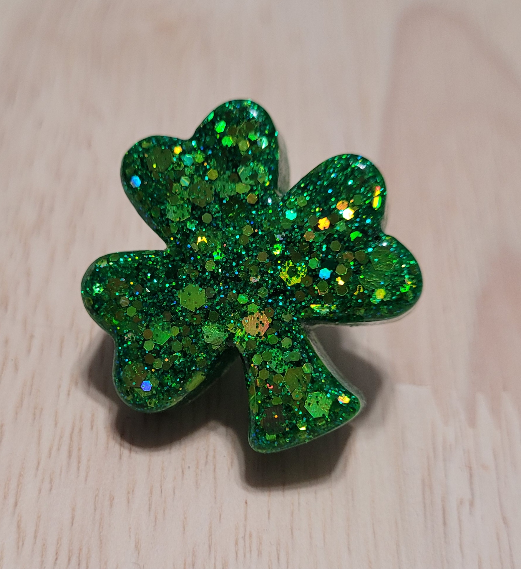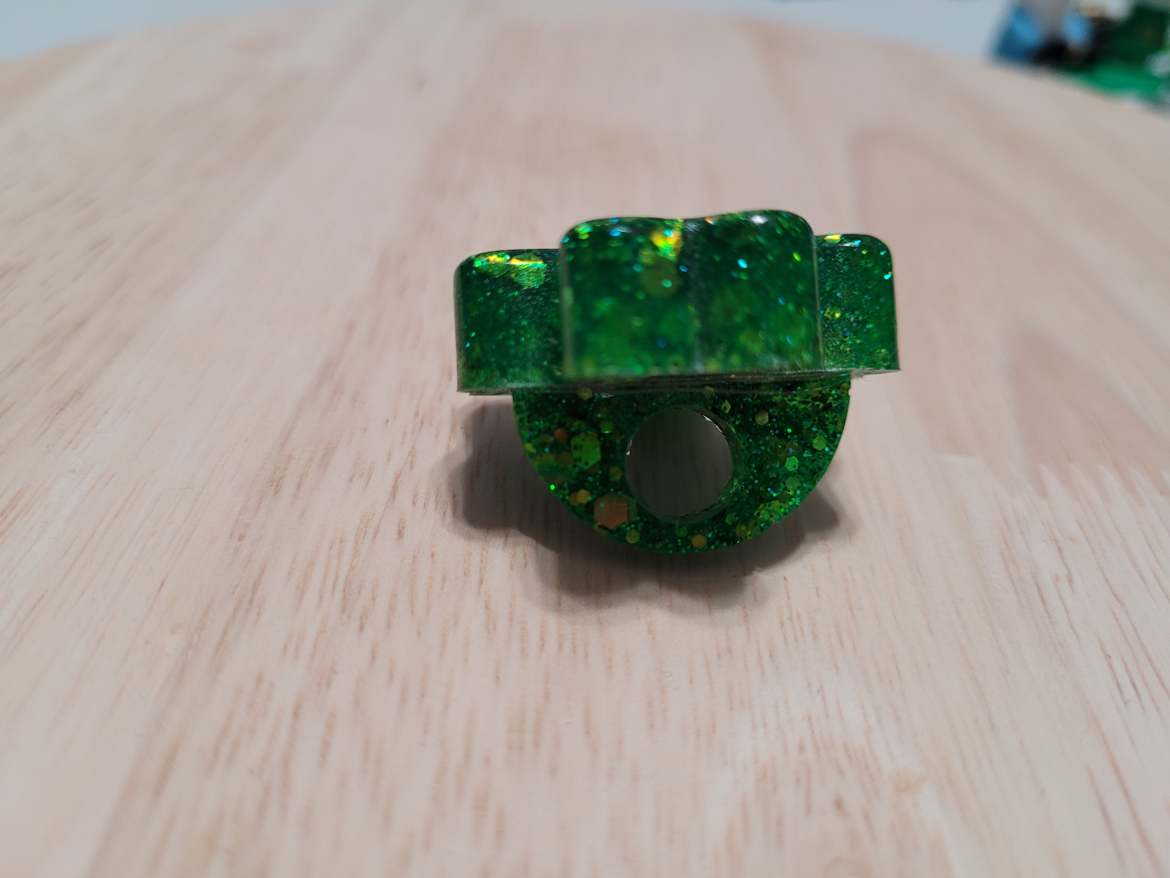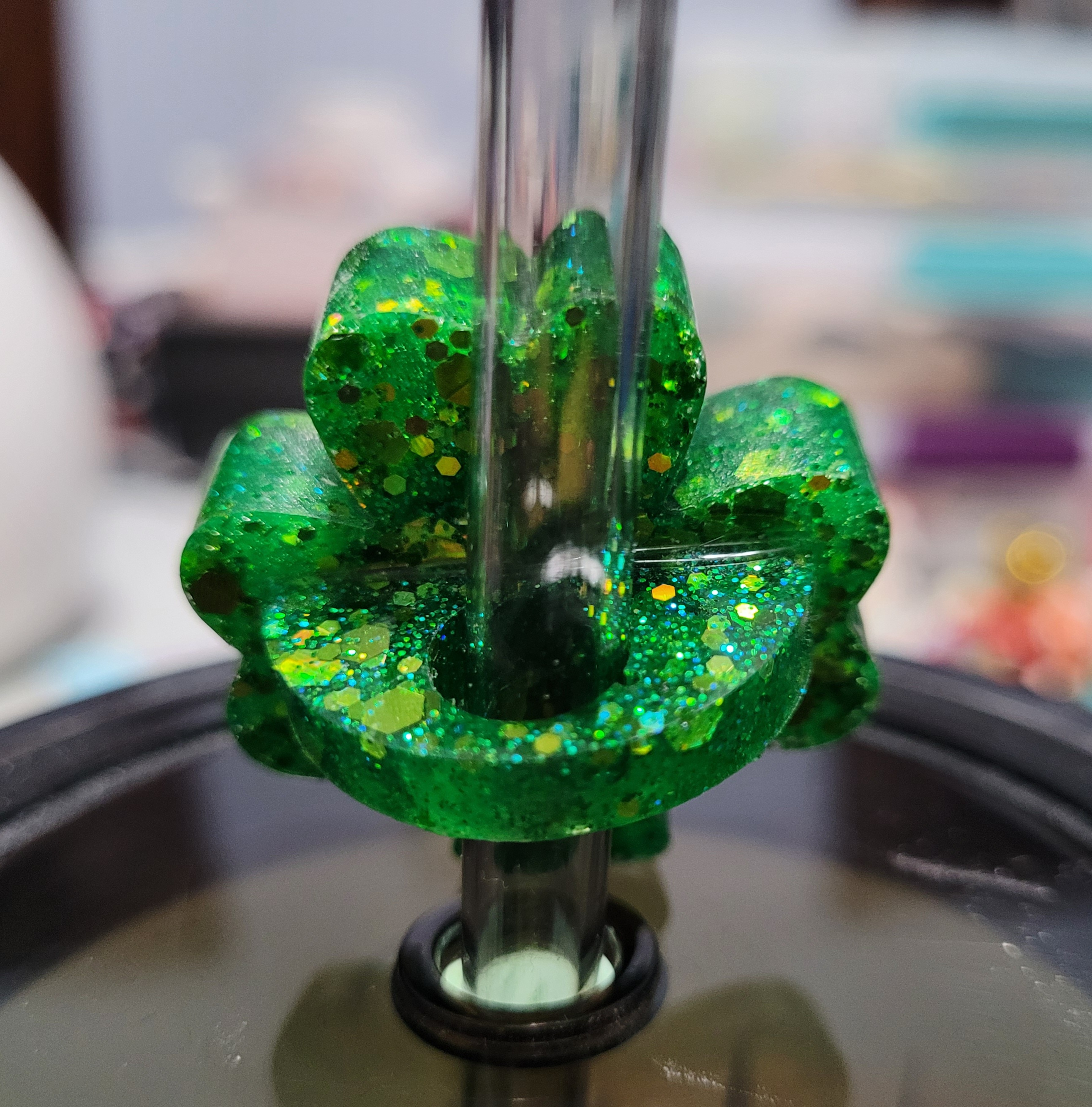 Sparkly green shamrock straw toper for your tumblers. Made with resin and glitter. Measures 1.5in x 1.375in x 1in