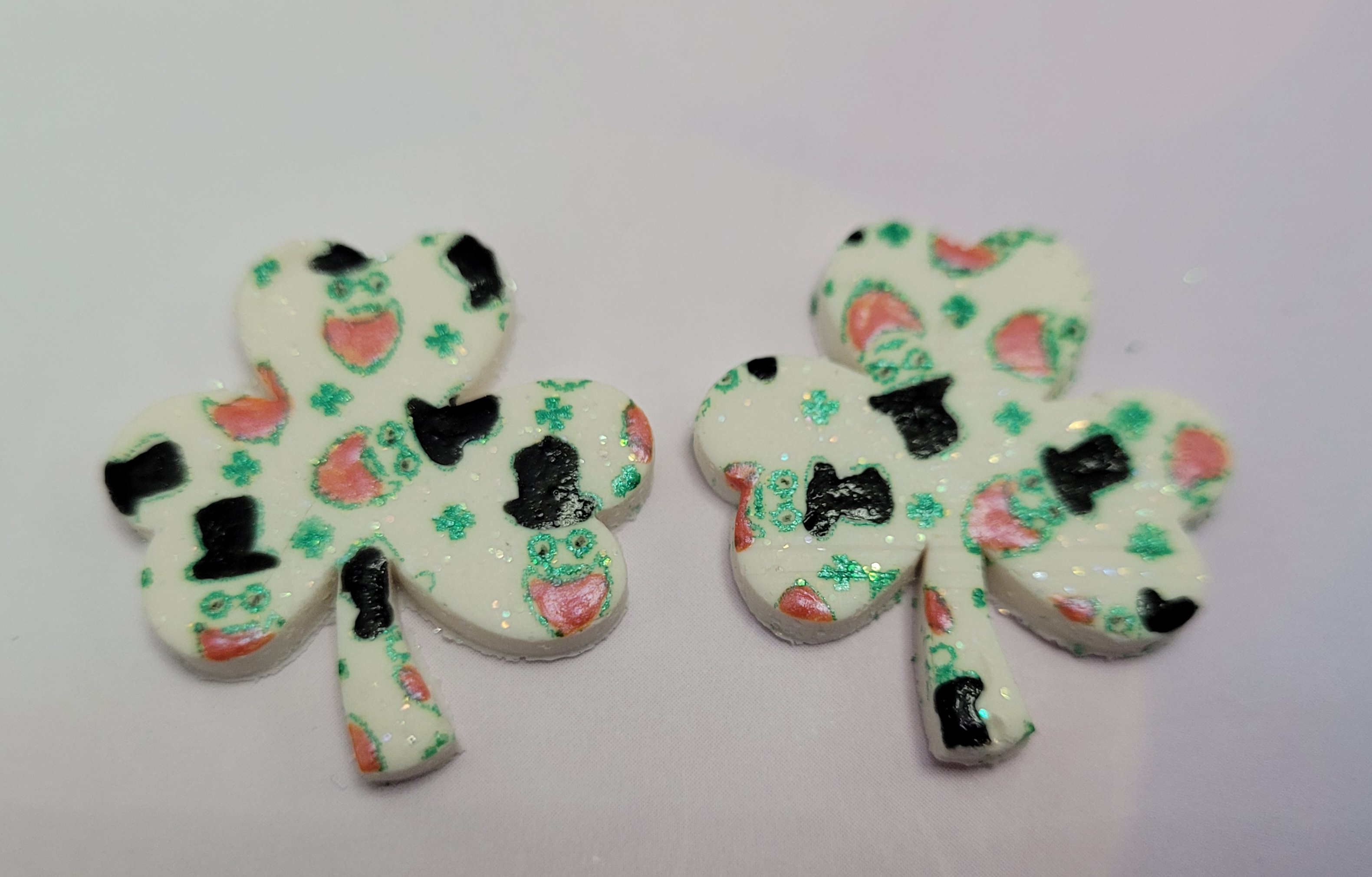 Show your spirit with this sports inspired pair of Shamrock Earrings. Featuring a Gritty themed leprechaun pattern, they measure 1in tall from top of the leaf to stem. Slightly made to order, when checking out let me know in the notes whether you want them to be clip-ons or studs, I'll attach the correct nickel-free findings and have them shipped within 48 hours. Made with glitter polymer clay, acrylic paint, and sealed with acrylic sealant.