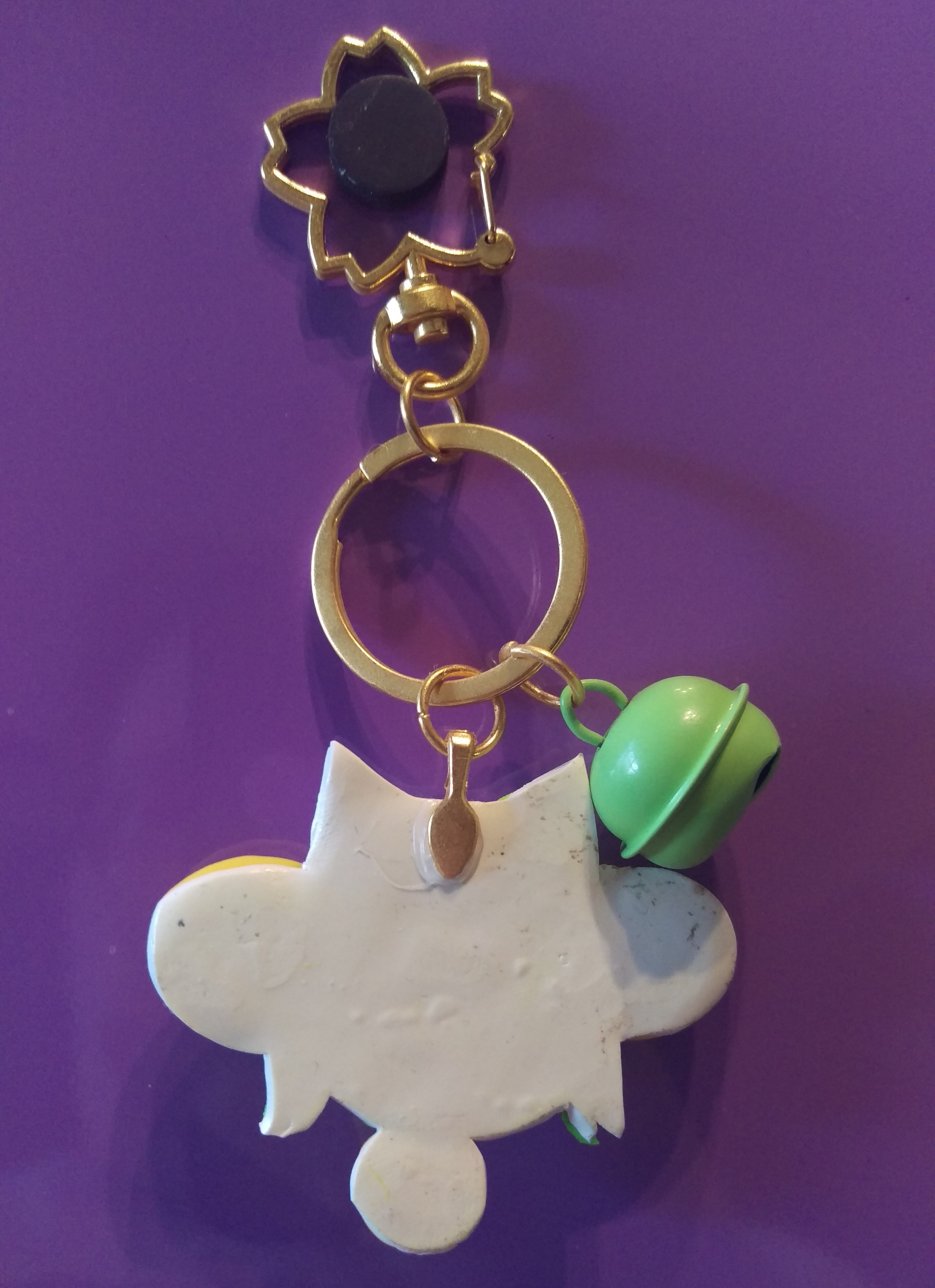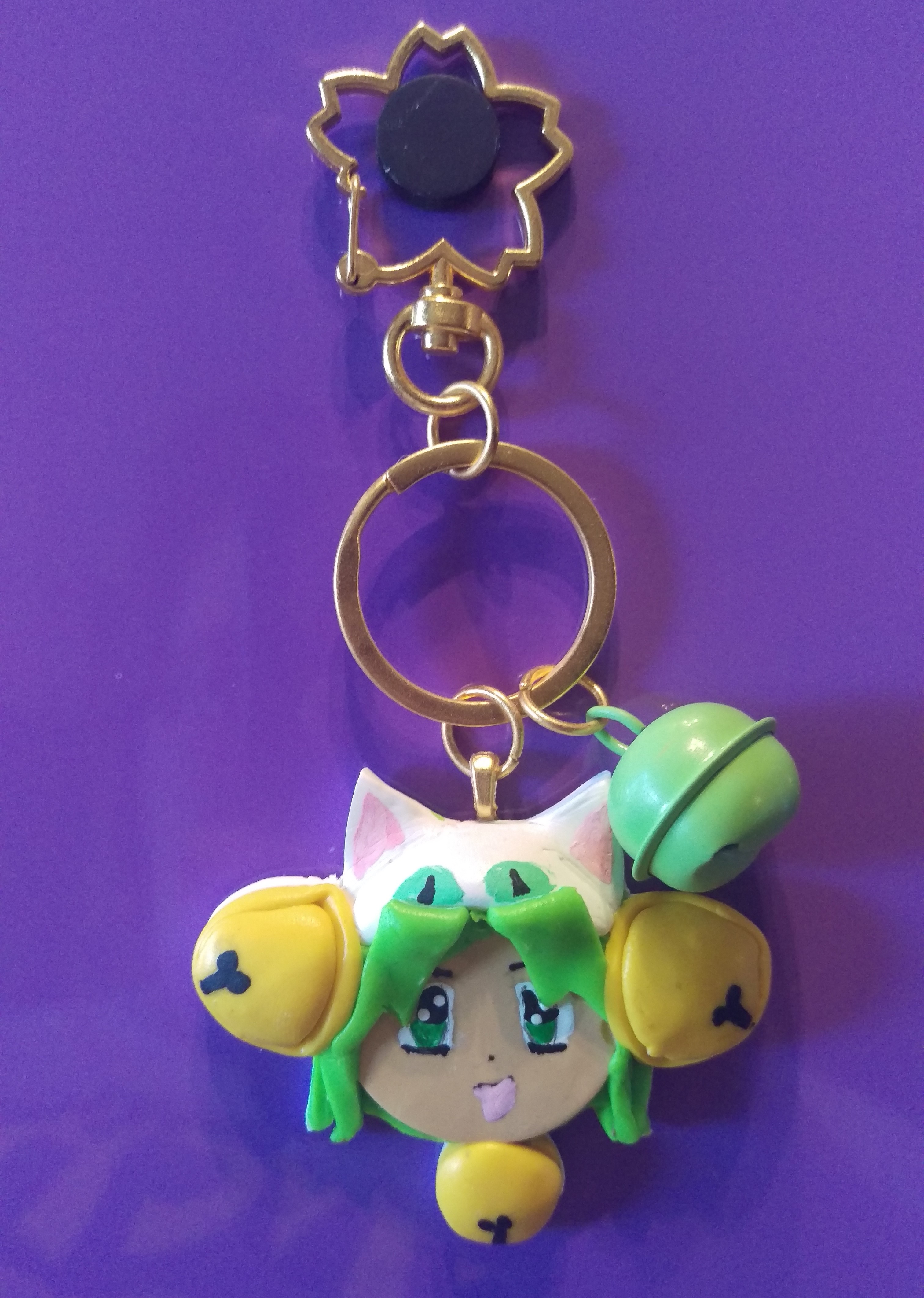 Keychain of the main character of Di Gi Charat, also named Dejiko. Made with polymer clay, metal findings and bell, and sealed with acrylic sealant.