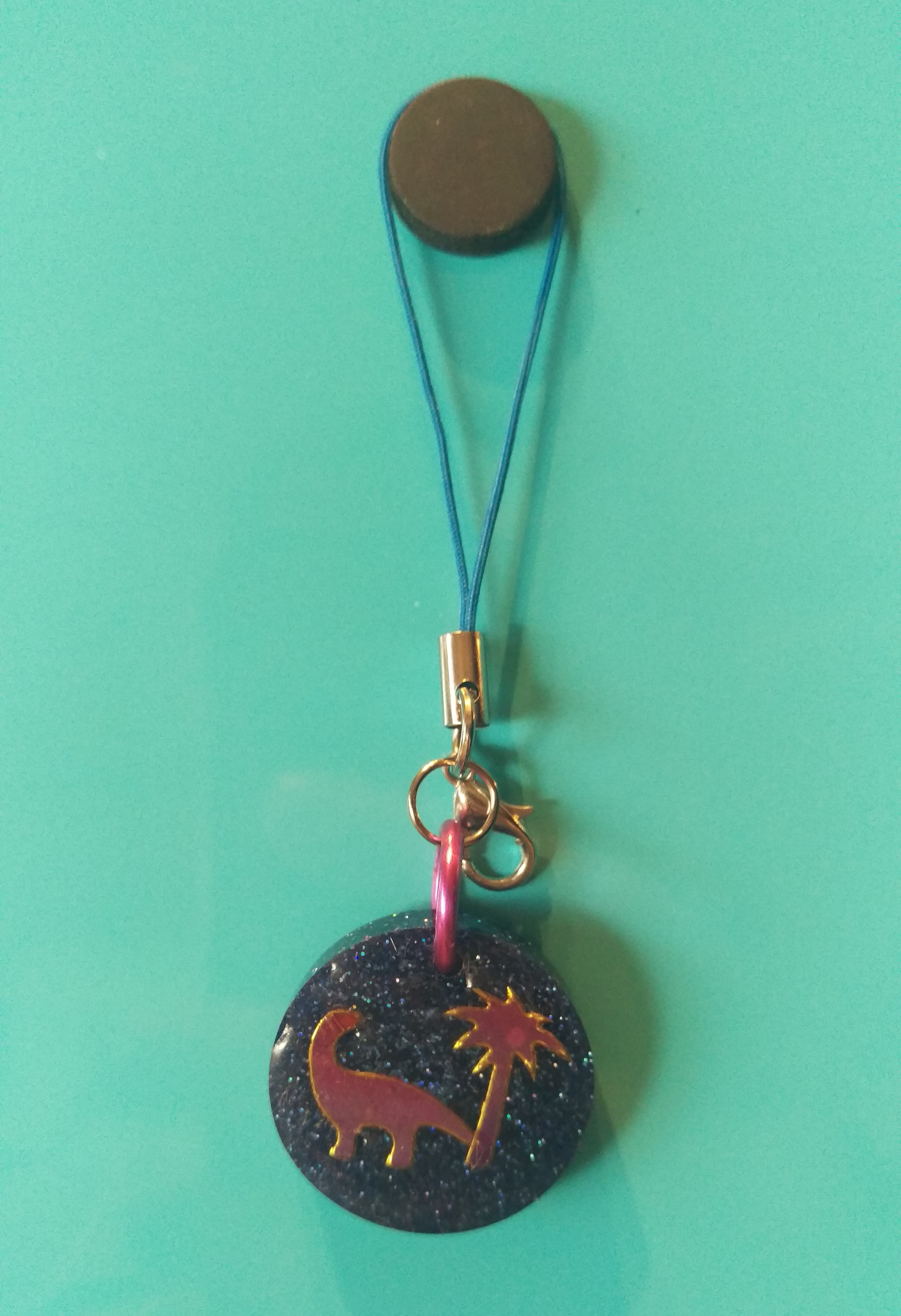 Resin, glitter and sticker phone charm depicting a little dinosaur and palm tree.