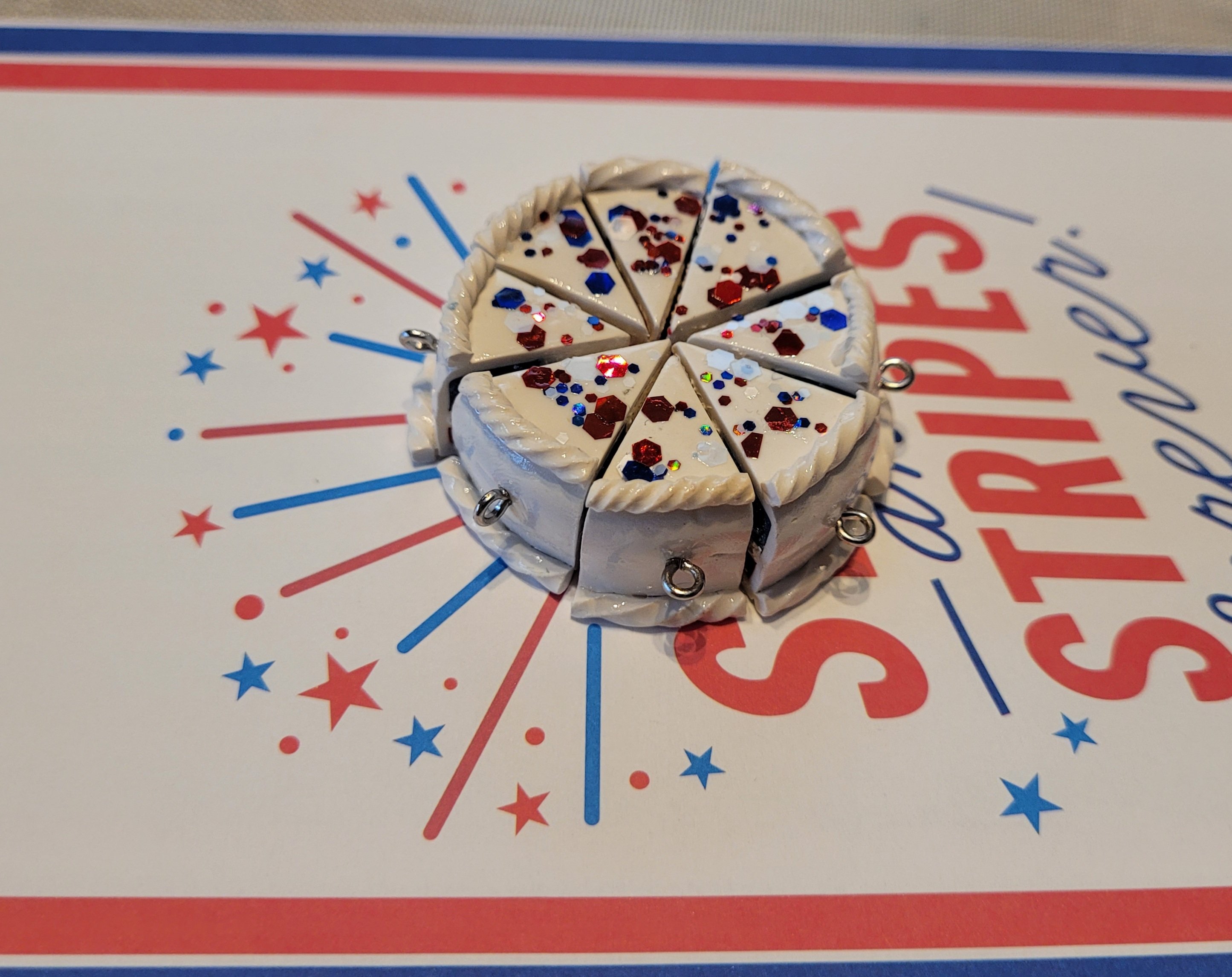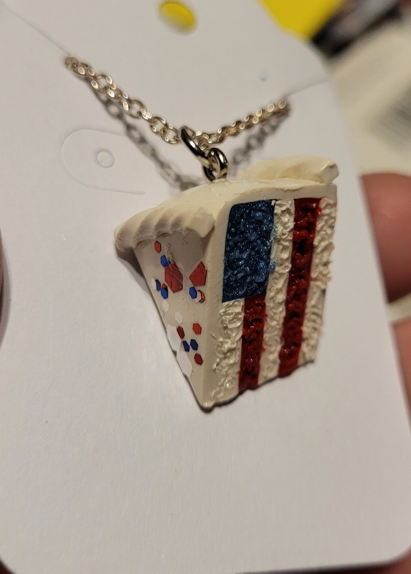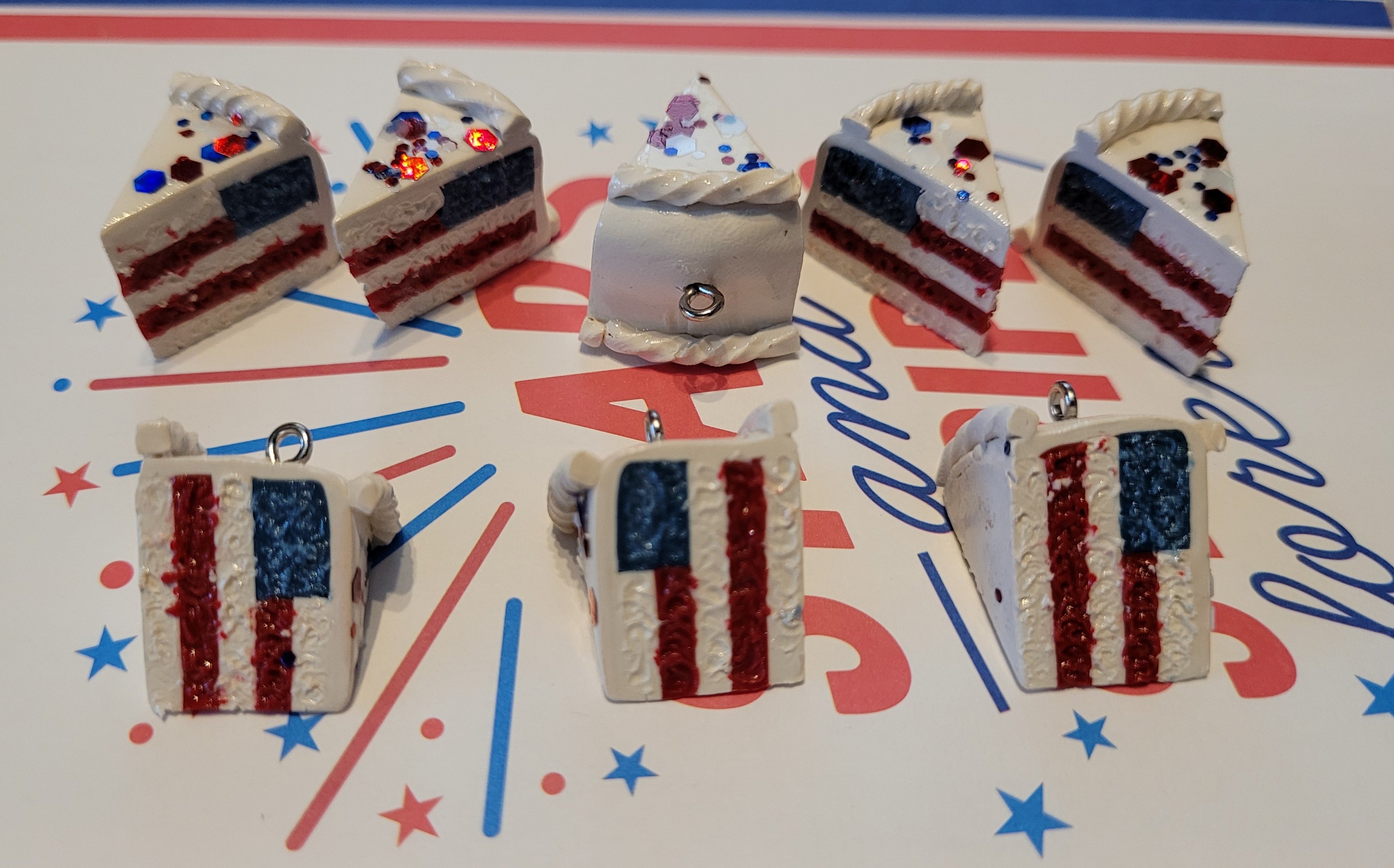 Adorable little patriotic cake necklaces with flag design on slices. Created with polymer clay, glitter, super gloss sealer and nickel free metal findings.