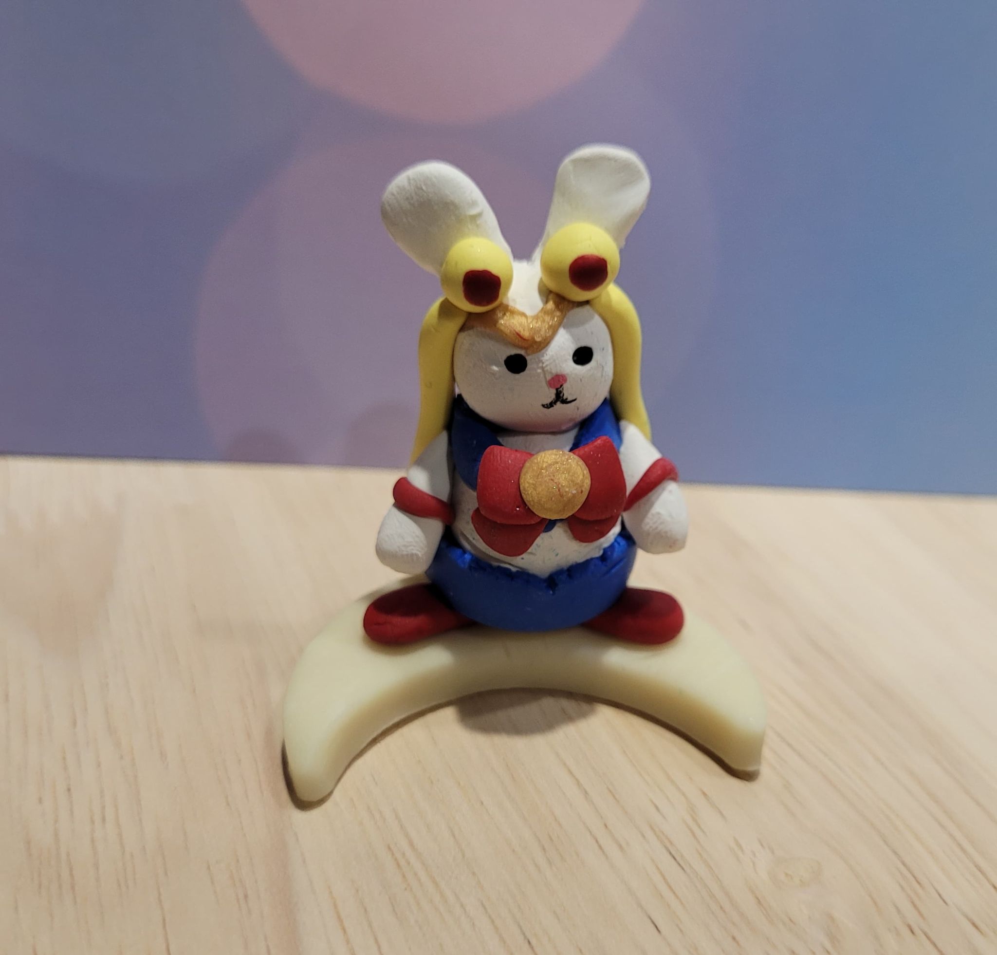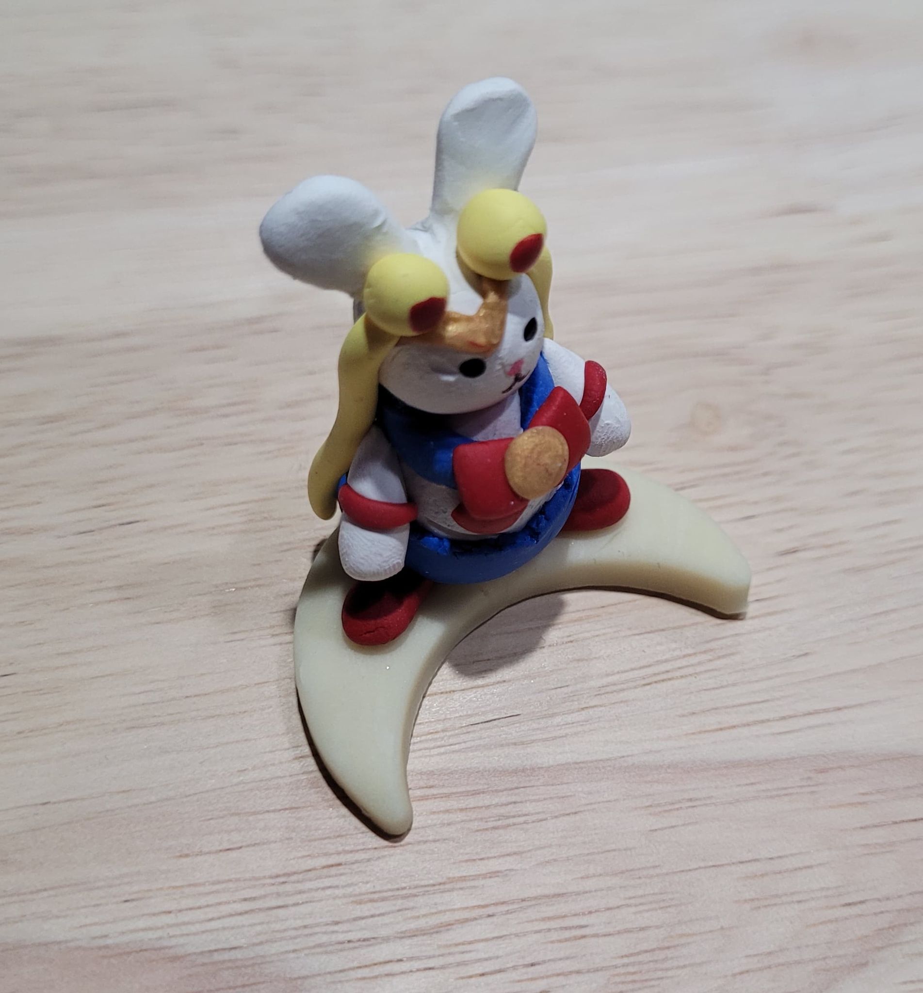 Hand sculpted polymer clay bunny dressed up as Sailor Moon with Glow in the dark moon base, Measures 2in tall and base 1.75 in.
