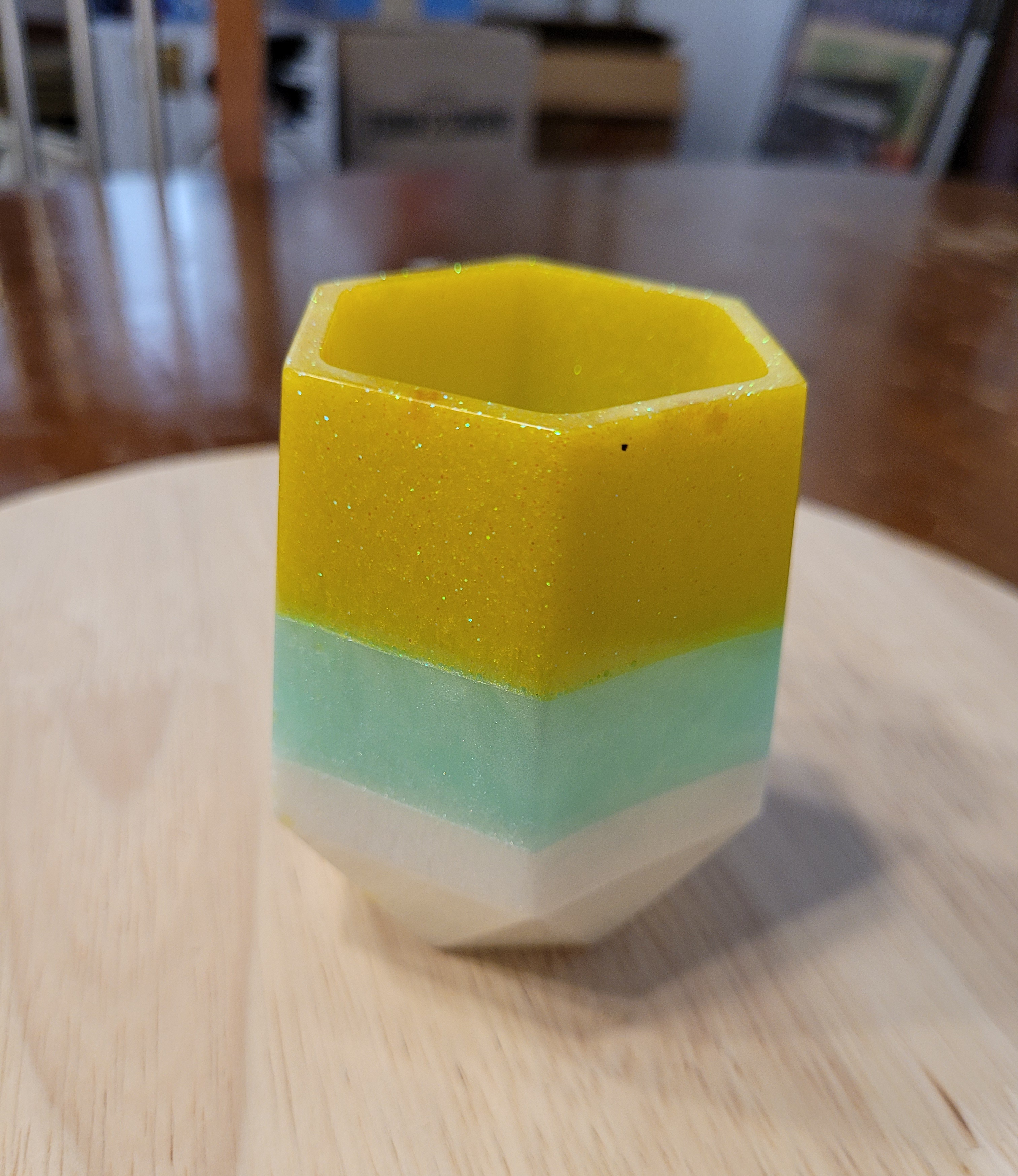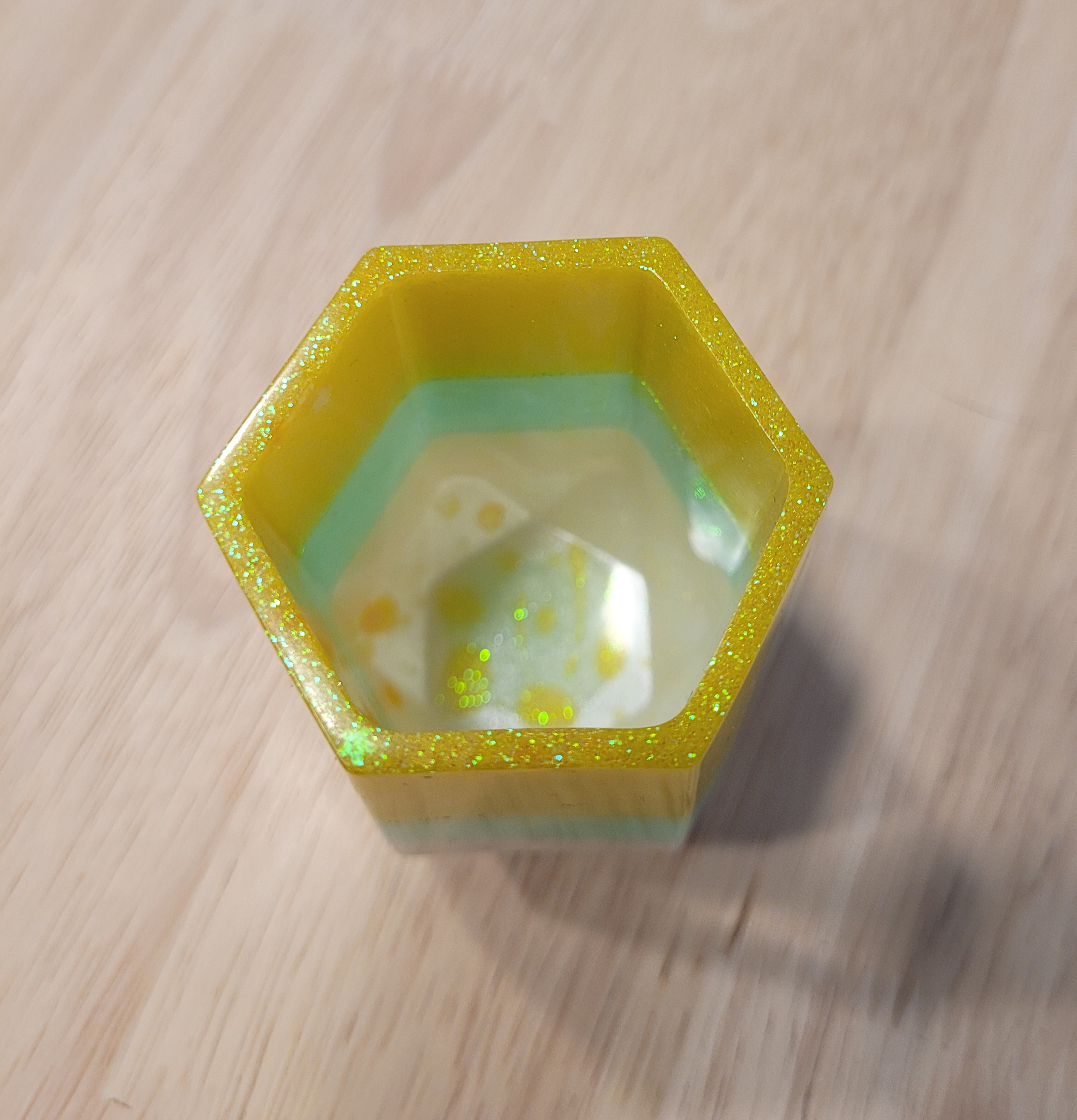 Mini vase made with resin, glitter and shimmery mica powders. Measures 2.75 in tall, very bottom measuring at the points is 1.5 in wide, going out to 2.5in in the middle, then tapering at the top to 2.125in on the outer rim, inside rim is 1.75in wide. Very sparkly and shimmery, great for a small bouquet of flowers.