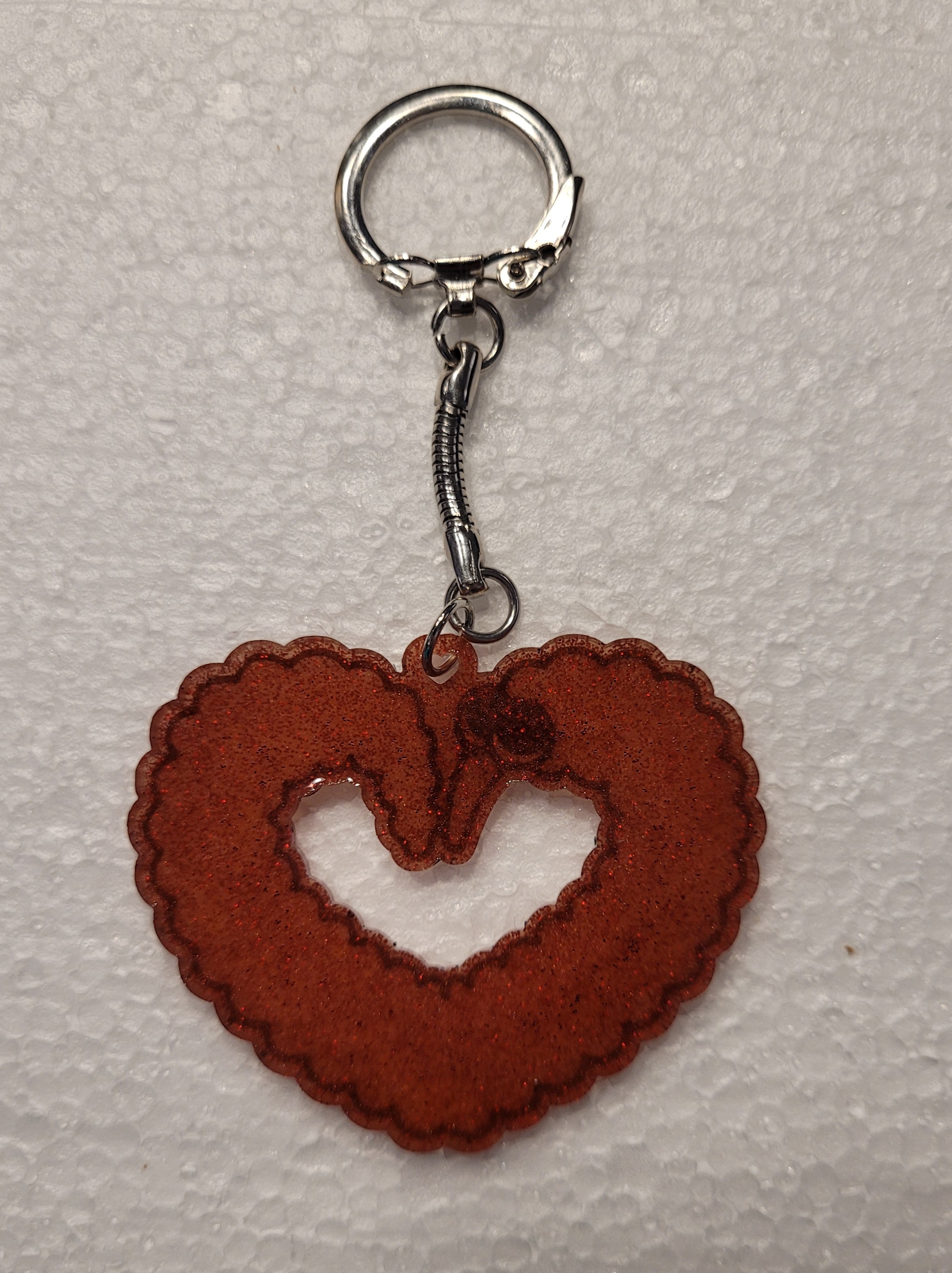 Keychain of a worm on a string in the shape of a heart. Made with resin, glitter, acrylic paint, acrylic sealant and metal findings. Just the resin piece measures 2 inches tall, 2 3/8 inches wide, and 1/8 inches thick.