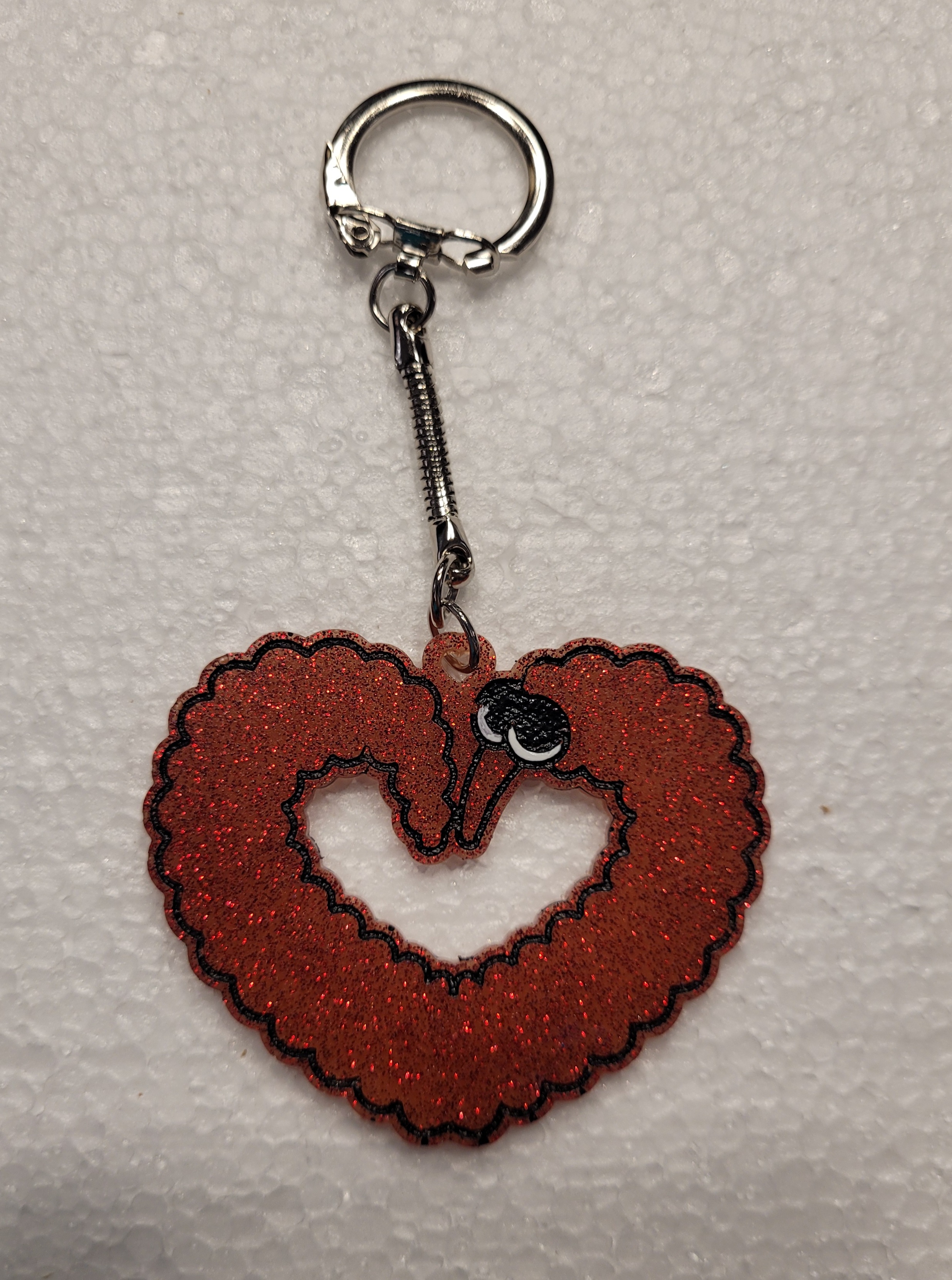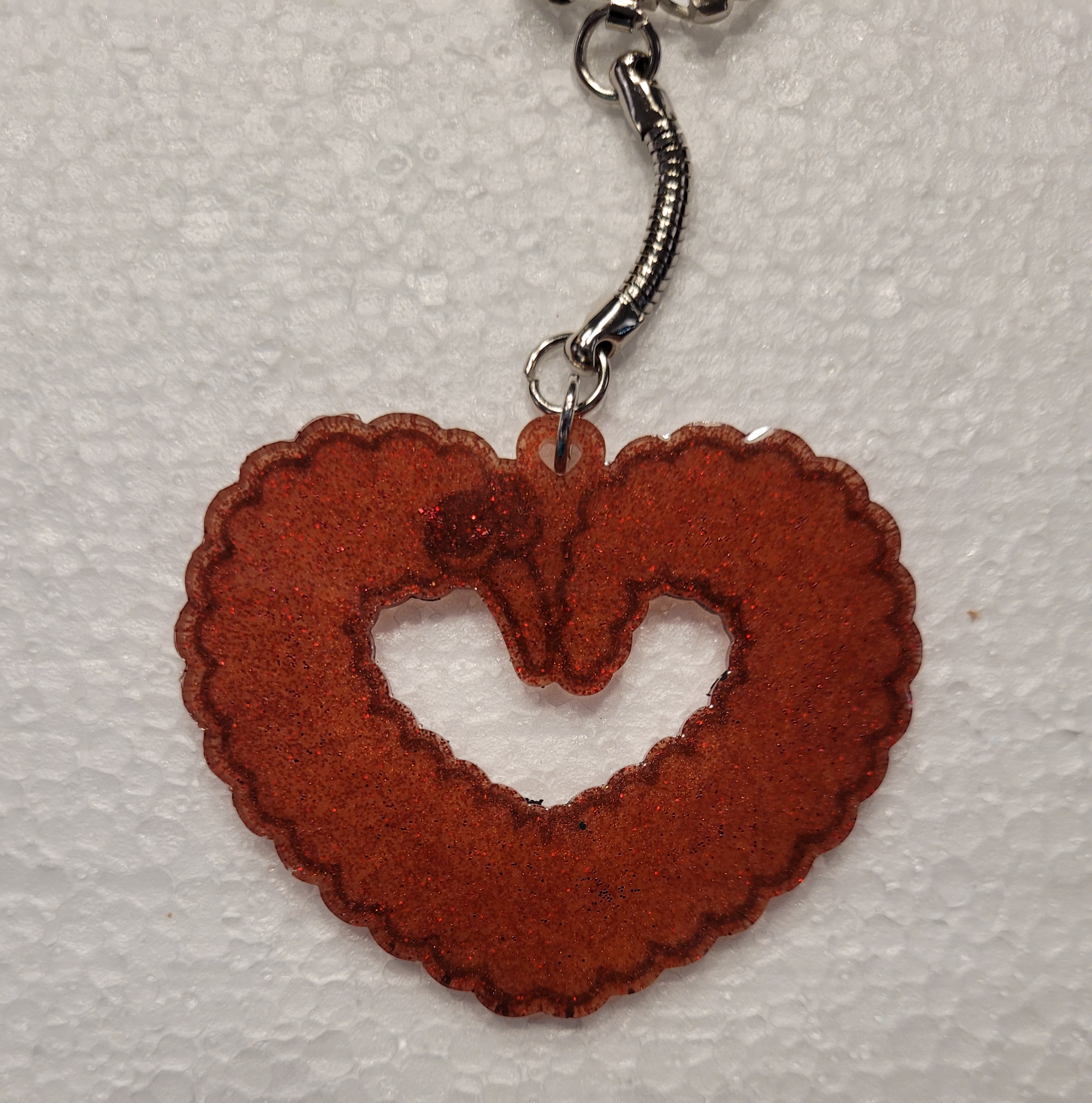 Keychain of a worm on a string in the shape of a heart. Made with resin, glitter, acrylic paint, acrylic sealant and metal findings. Just the resin piece measures 2 inches tall, 2 3/8 inches wide, and 1/8 inches thick.