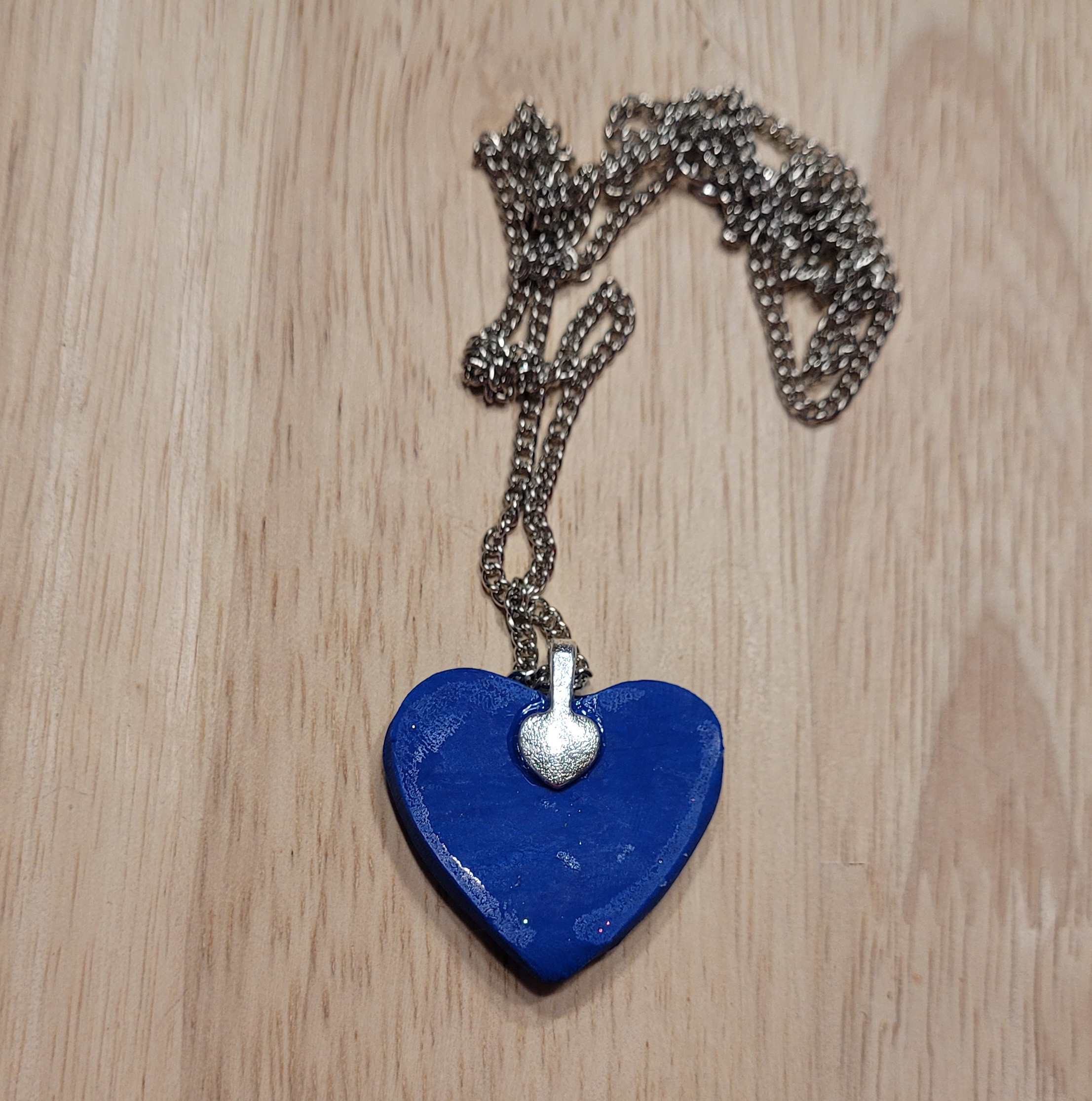 Earth in the shape of a heart necklace I honor of Earth Day. Made with polymer clay, glue, and nickel-free metal findings. Chain measures 24in.