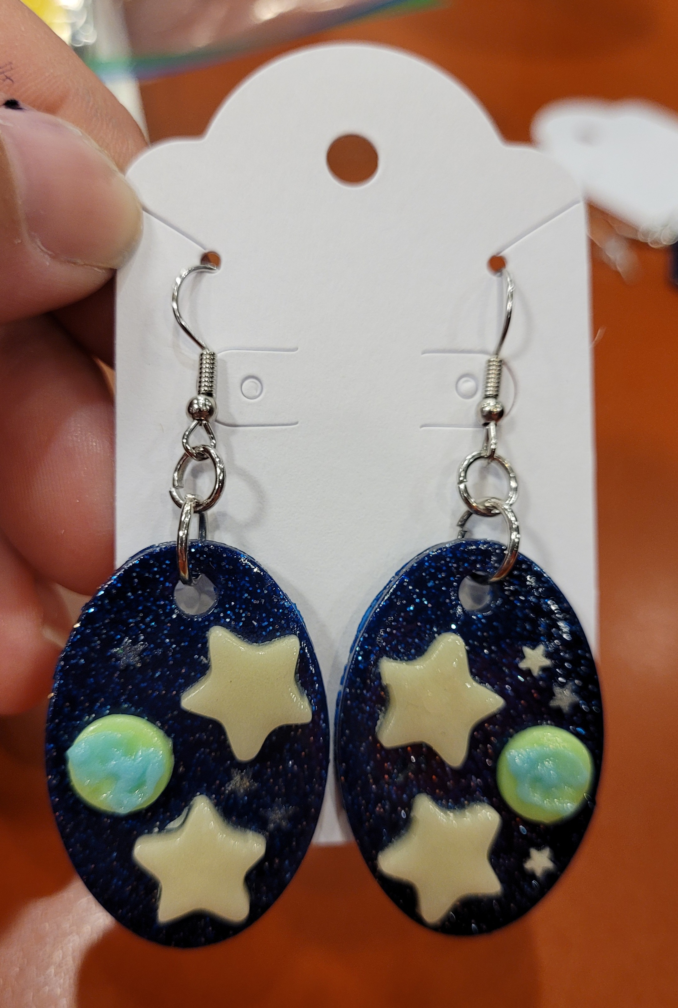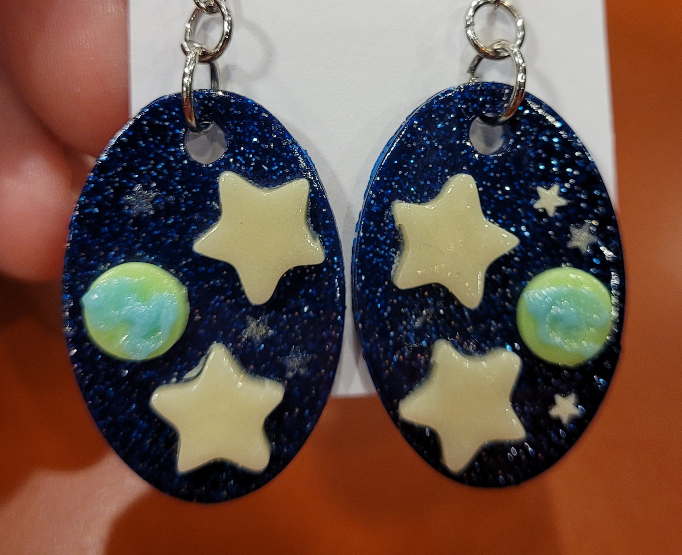 These earrings are out of this world! This polymer clay earring set features a planet and stars, and parts of it glow on the dark. Sealed with acrylic sealer and using nickel free metal findings.