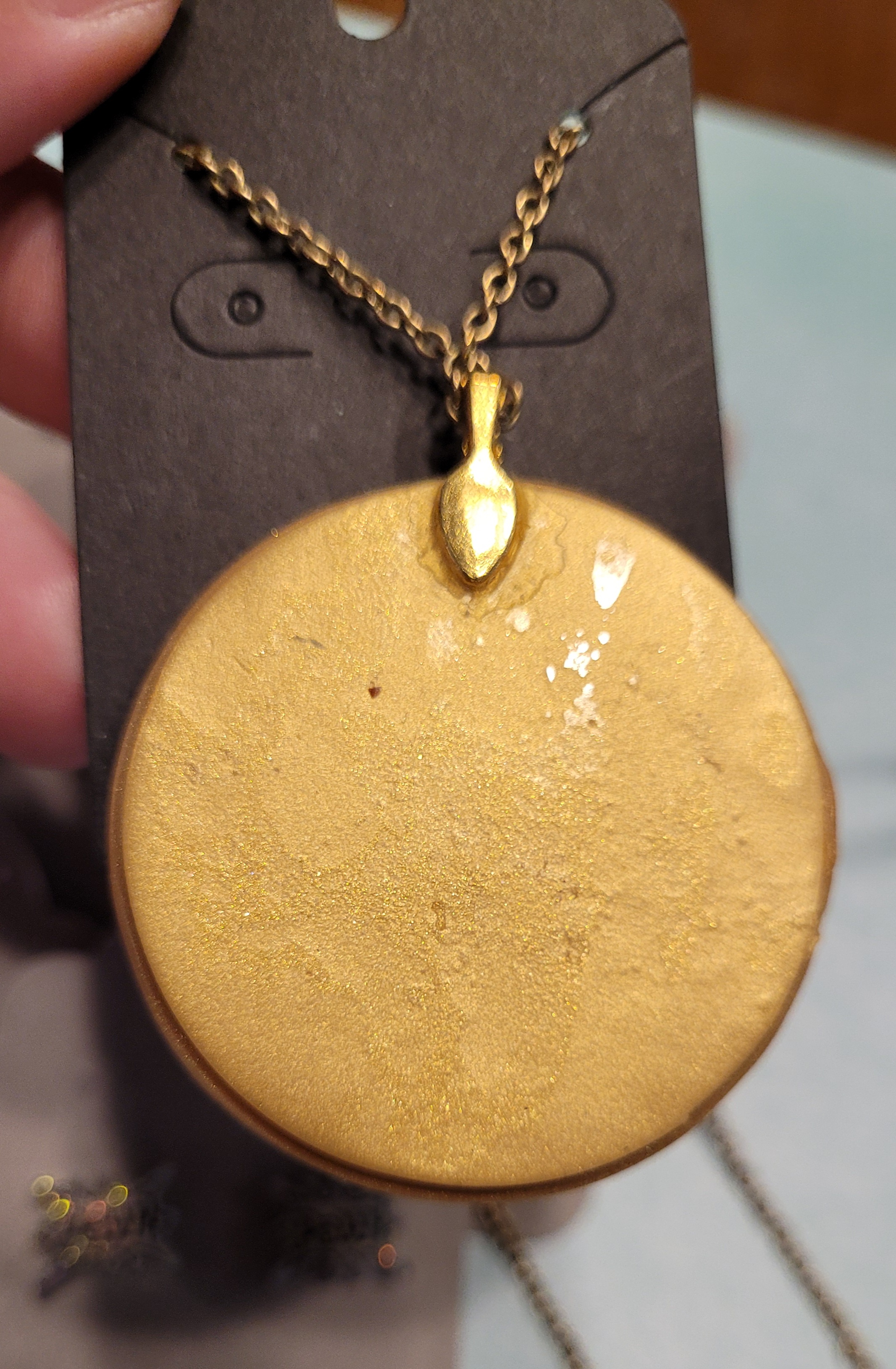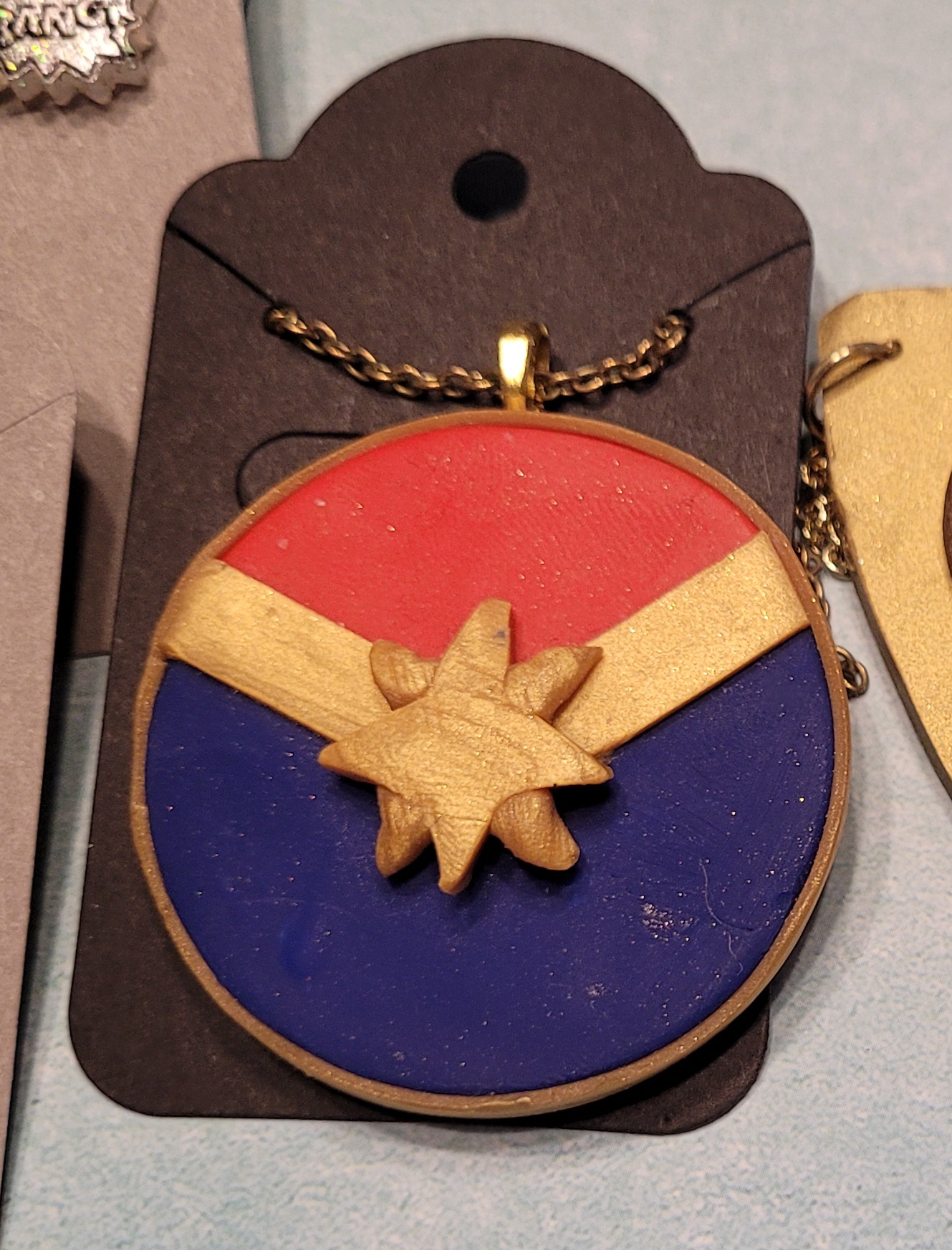 Pendant inspired by Captain Marvel's costume in the movie. Made with polymer clay and nickel free metal findings, the chain measures 18.5 inches long, and pendant 1.75 inches tall.