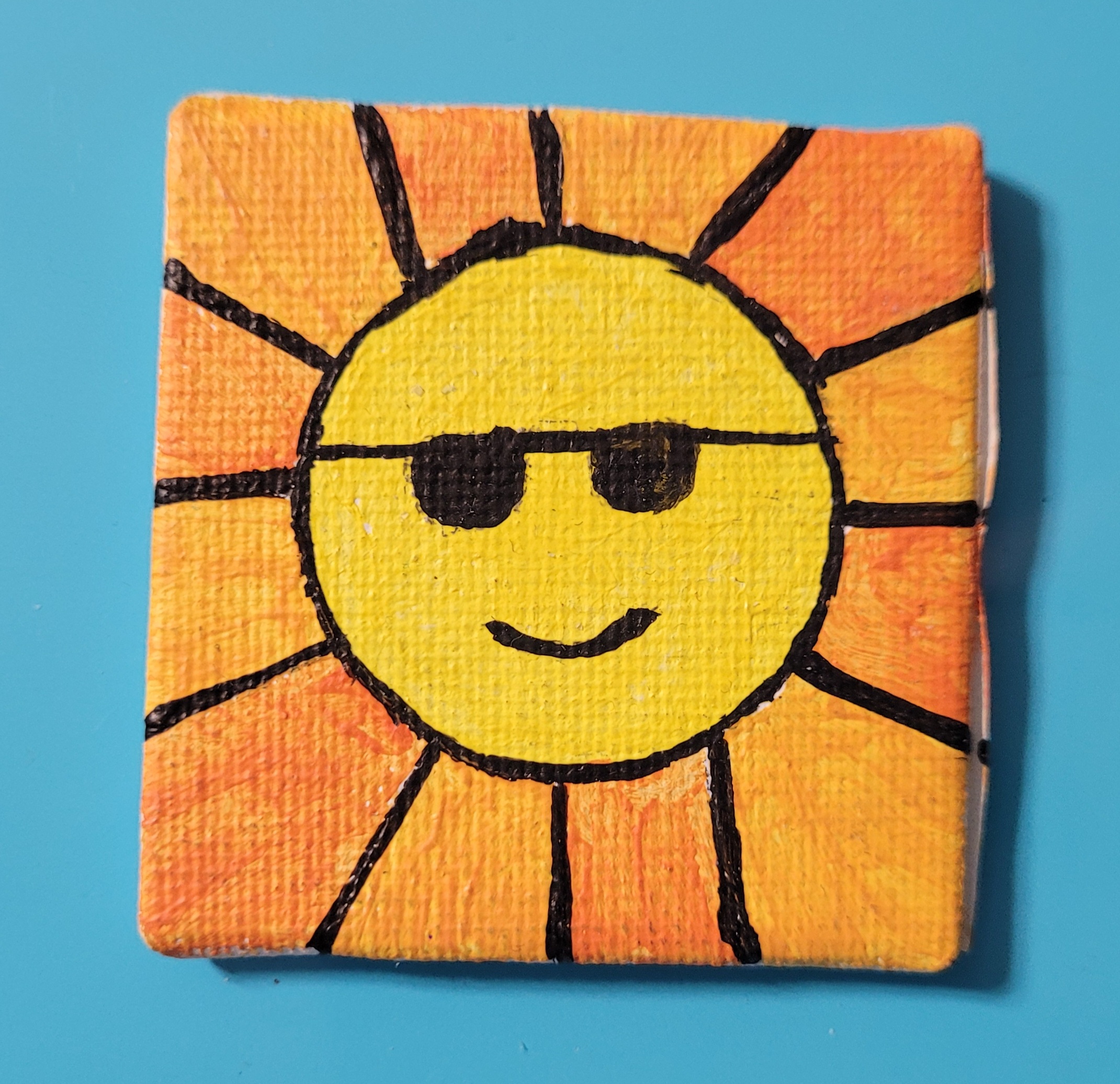Painting of a sun so cool it has to wear shades. Hand painted with acrylic paint on a 2x2 canvas with magnetic backing.