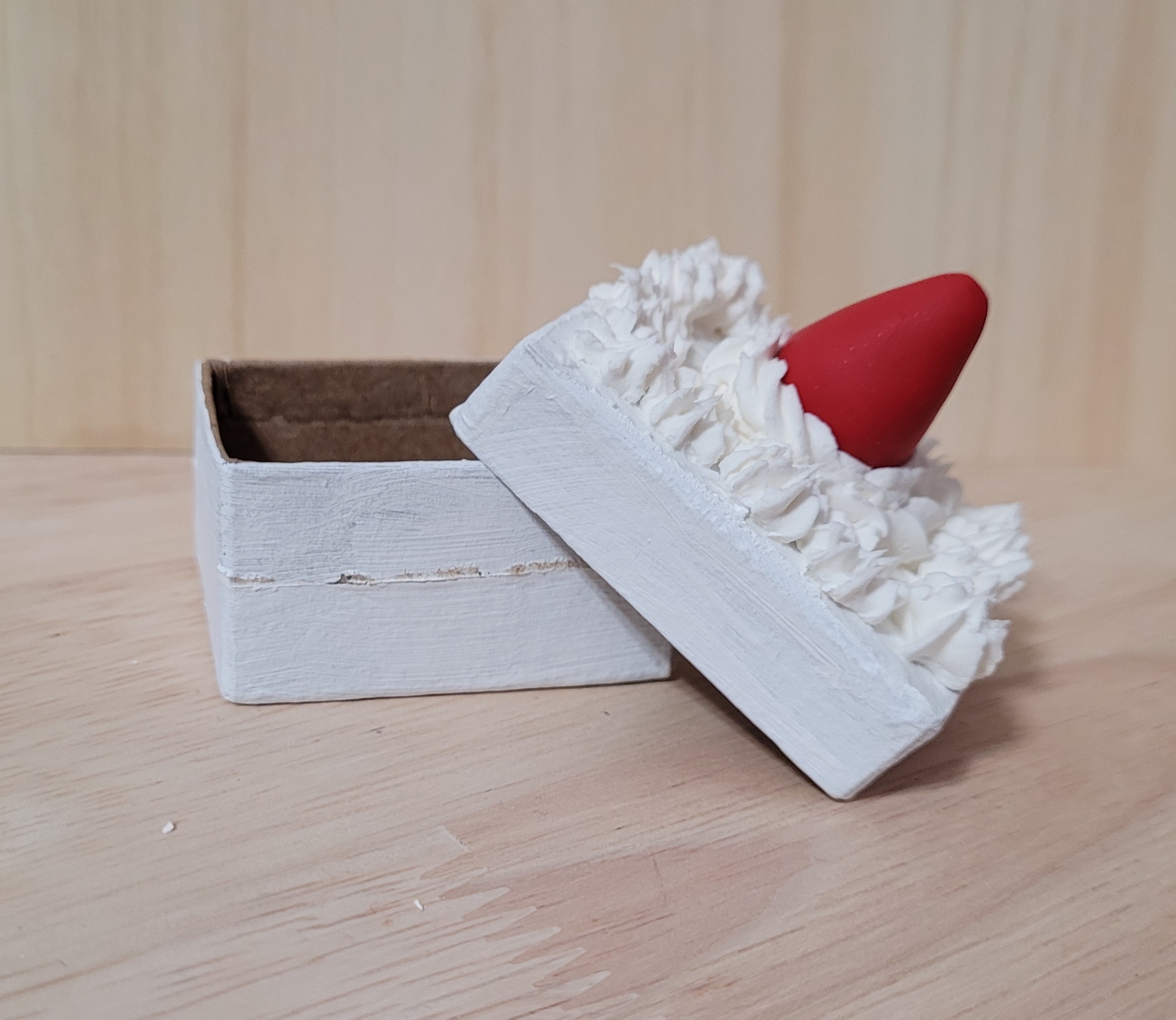 Strawberry Shortcake box to store all your treasures in. Made using a paper mache box base, painted with acrylic paint, and topped with collage clay/decowhip with polymer clay strawberry.