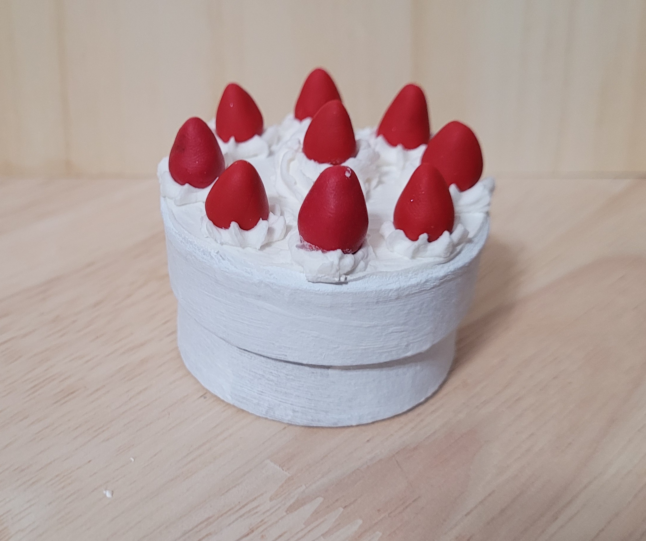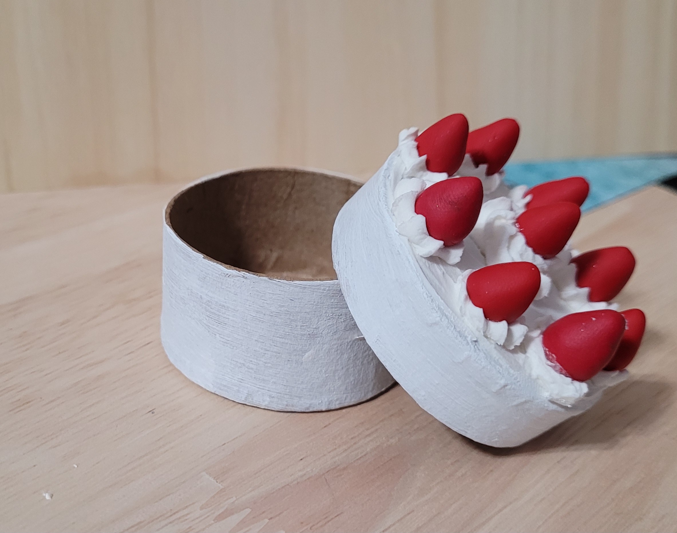 Strawberry Shortcake box to store all your treasures in. Made using a paper mache box base, painted with acrylic paint, and topped with collage clay/decowhip with polymer clay strawberries.