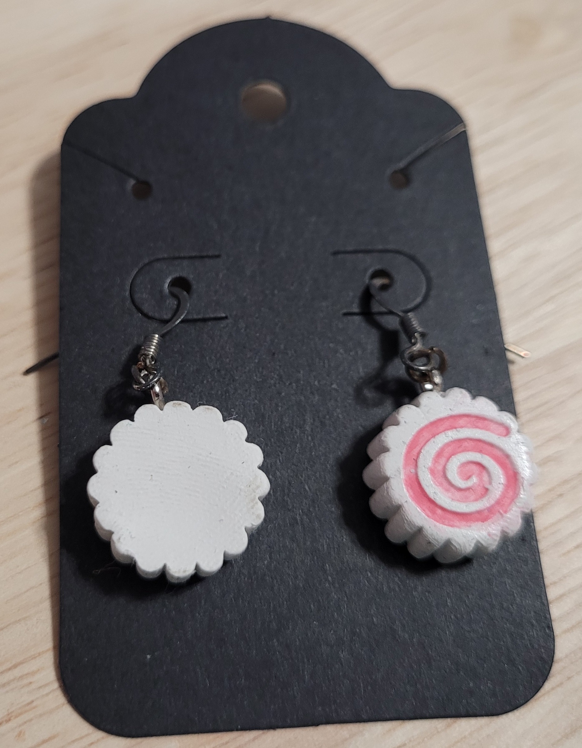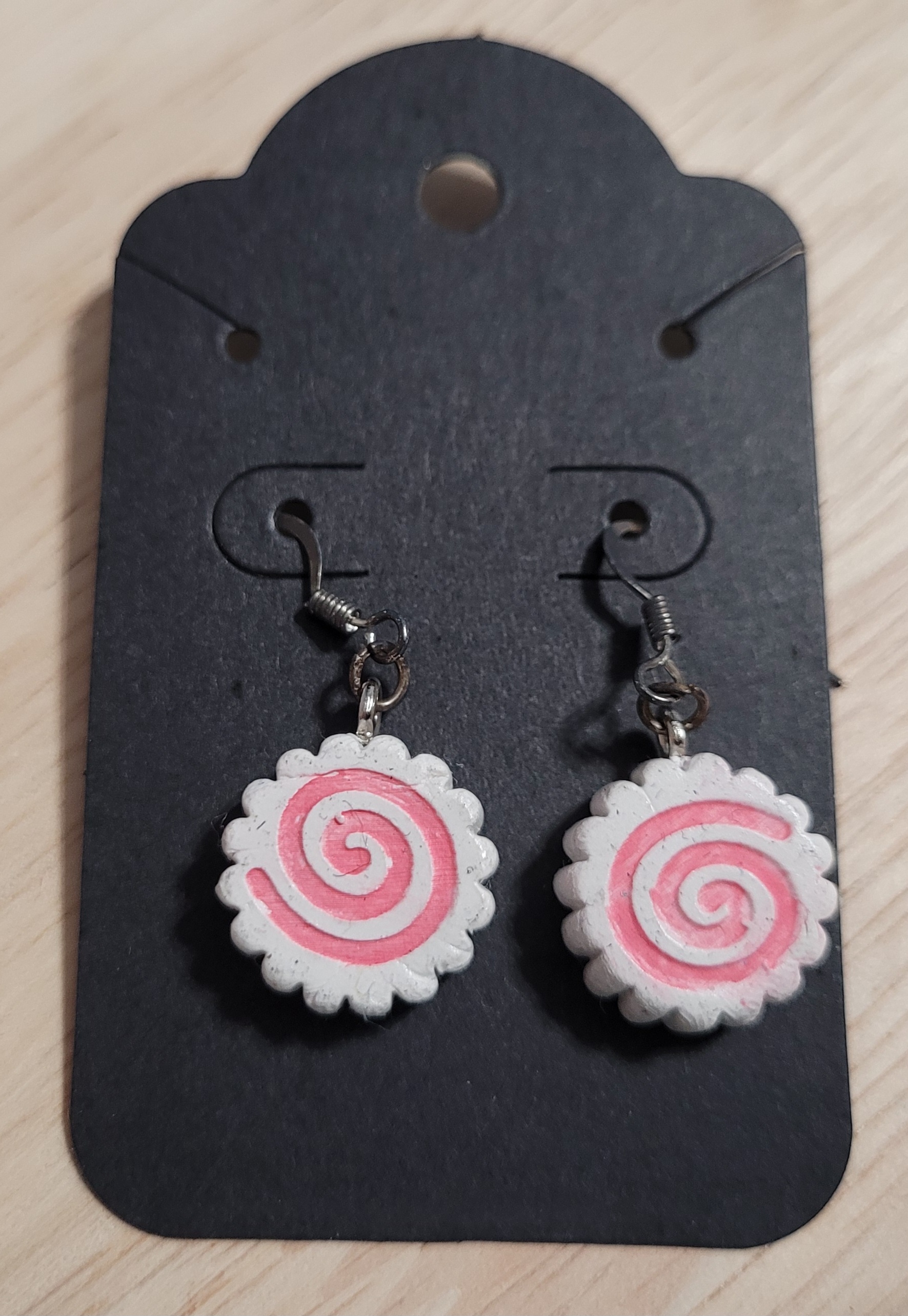 Polymer clay earrings made to look like the popular ramen add in of Narutomaki.