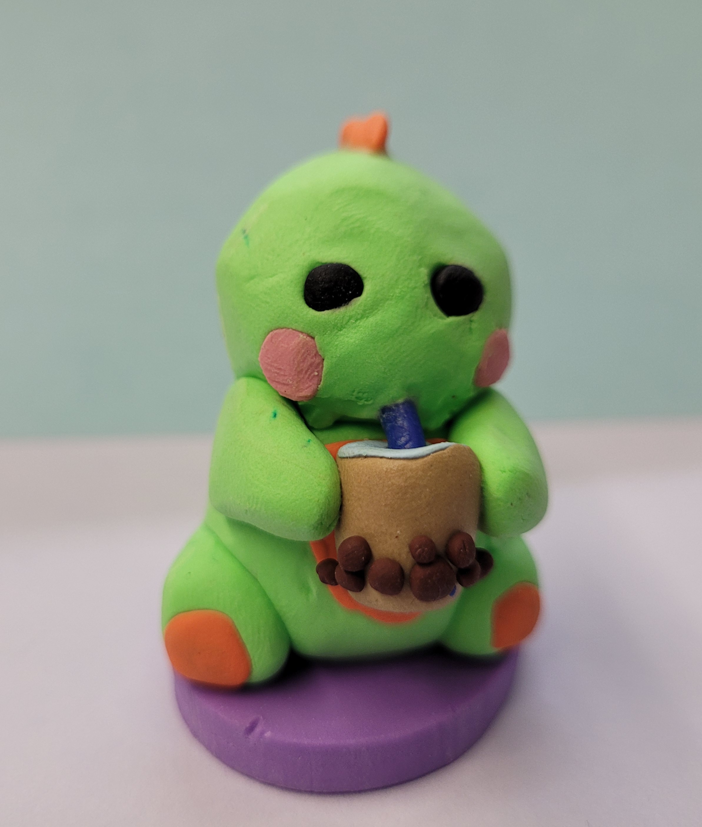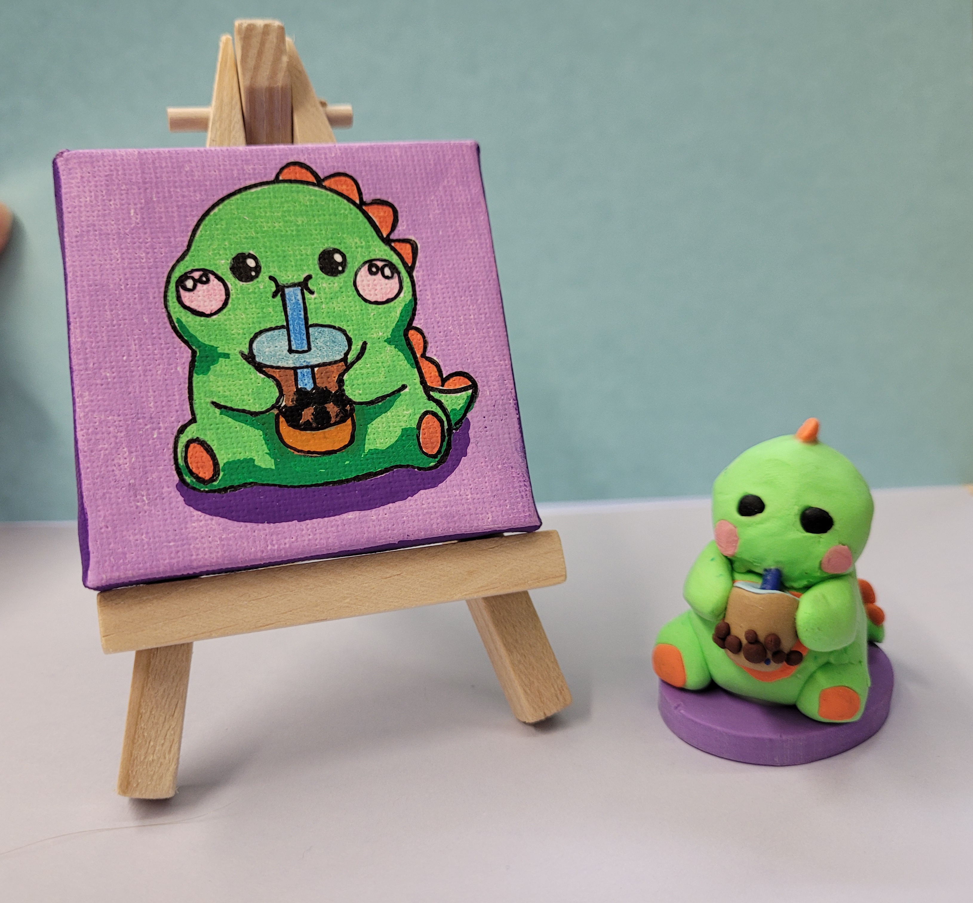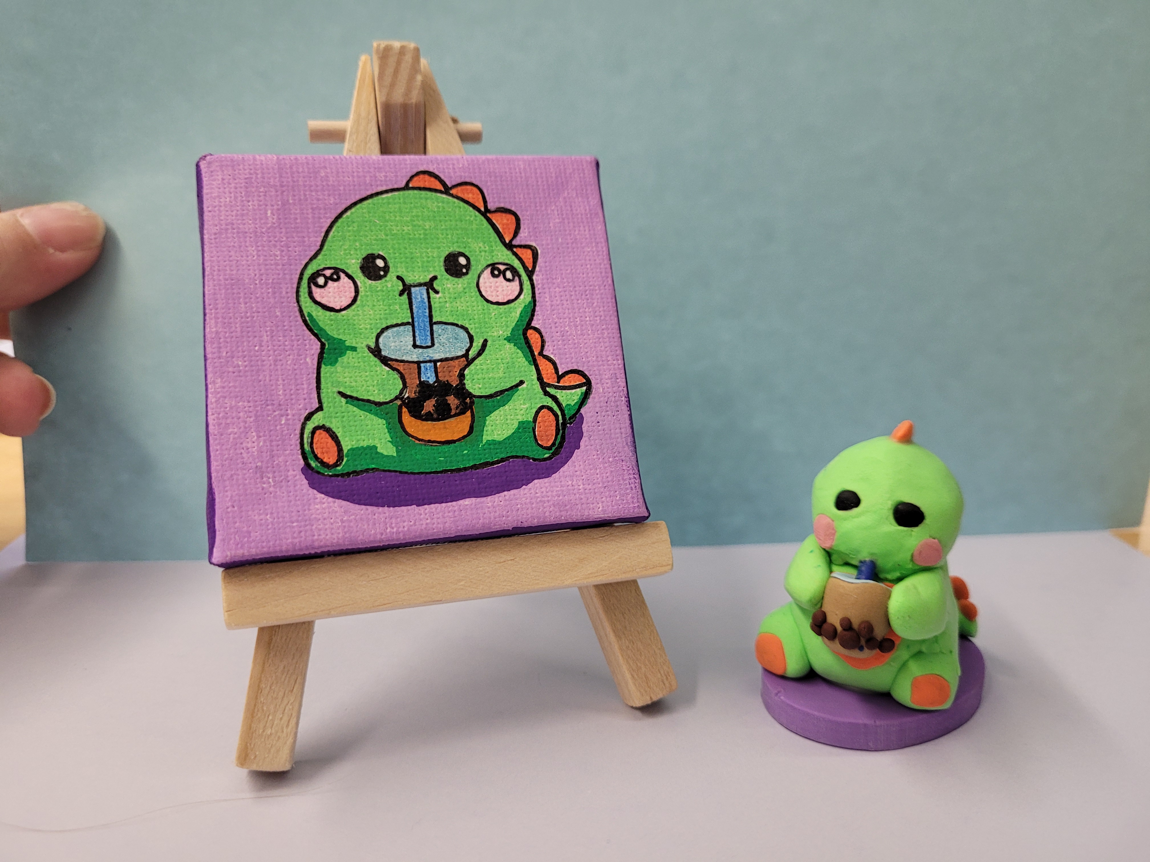 Cute little boba tea drinking dinosaur figure and painting set. Dino figure made with polymer clay, measures 2in tall, base is 1.75in x 1.25in. Canvas is 2.5in x 2.5in. Easel is included, 5in tall, so you get all three items.