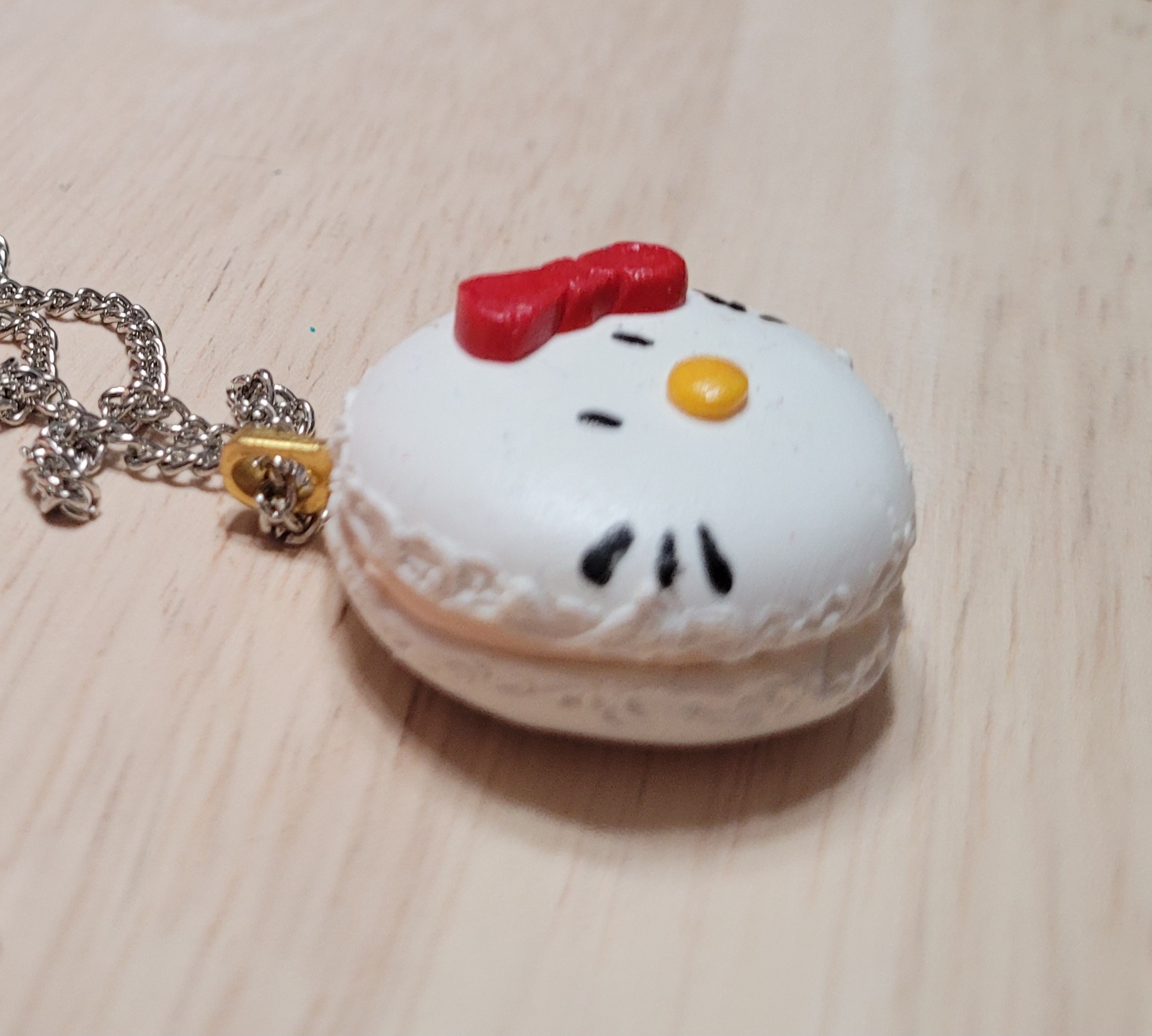 Adorable kitty themed macaron necklace. Made with polymer clay, decoden whip/collage clay, and nickel free metal findings, great gift for the cute fan in your life. Chain is 24 inches long.