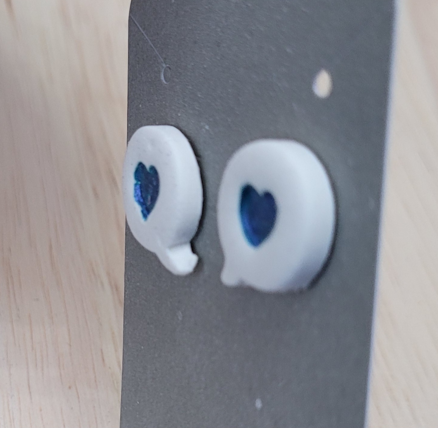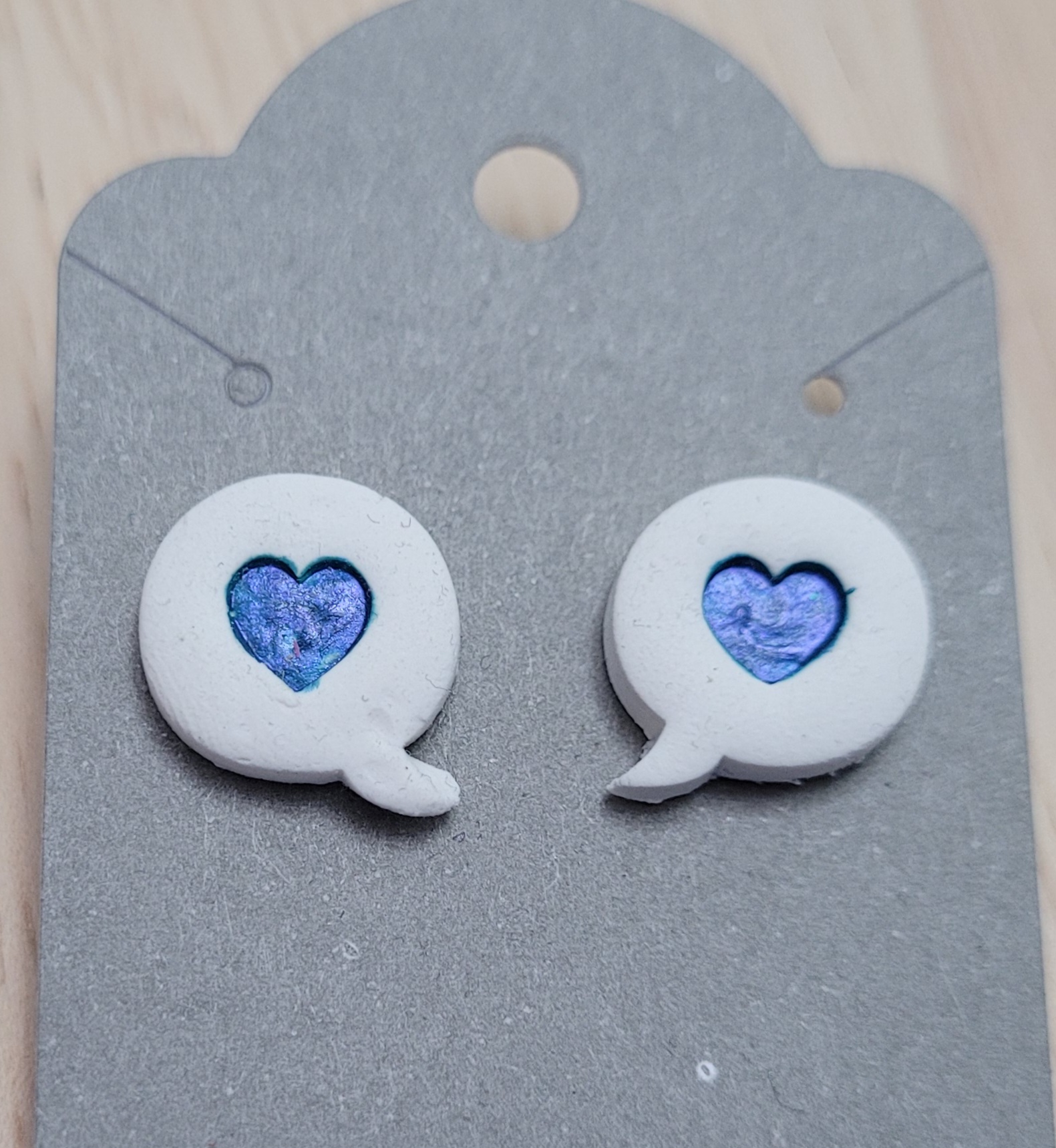 Word bubble stud earrings with blue hearts. Made with polymer clay, colorshift acrylic paint, glue, and nickel free metal findings.