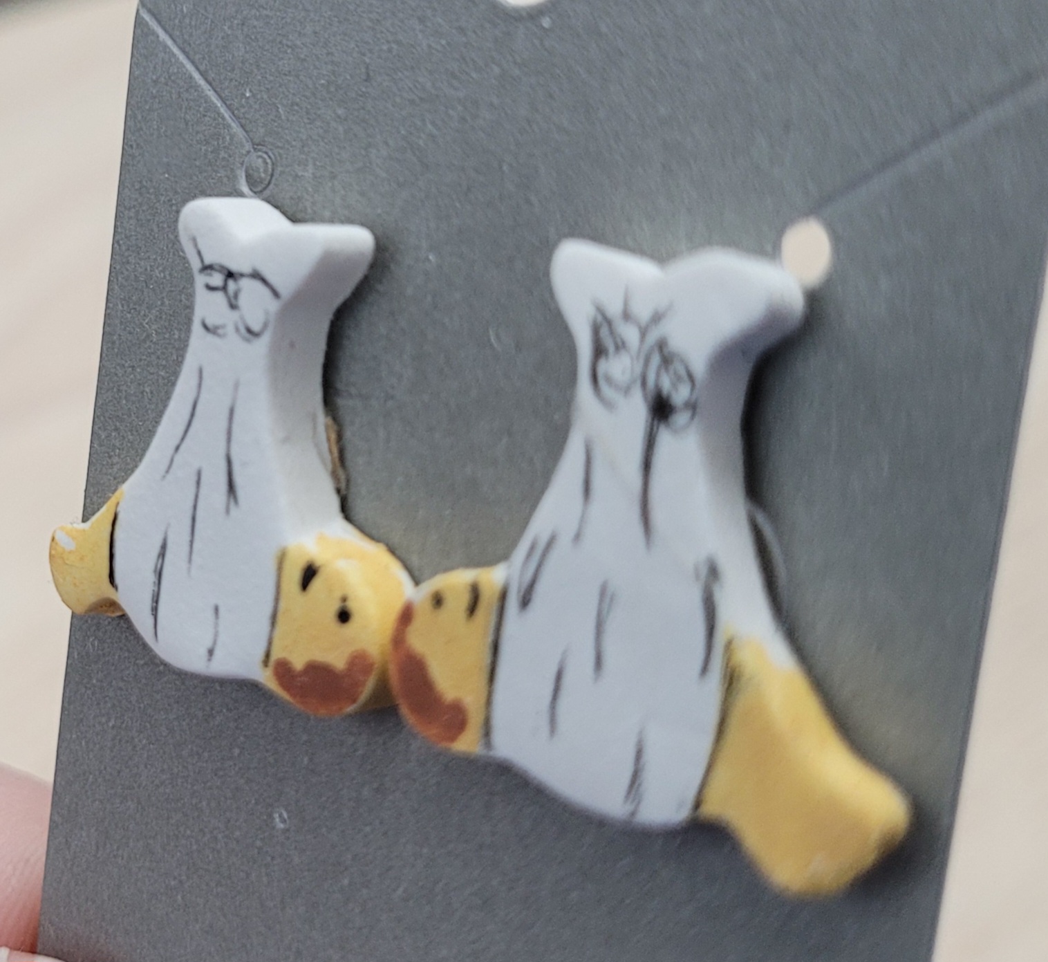 Pair of earrings depicting a baby being carried as if by the stork in a blanket to the new mother. Classic baby shower imagery earrings made with polymer clay, acrylic paint, glue, and nickel free metal findings.