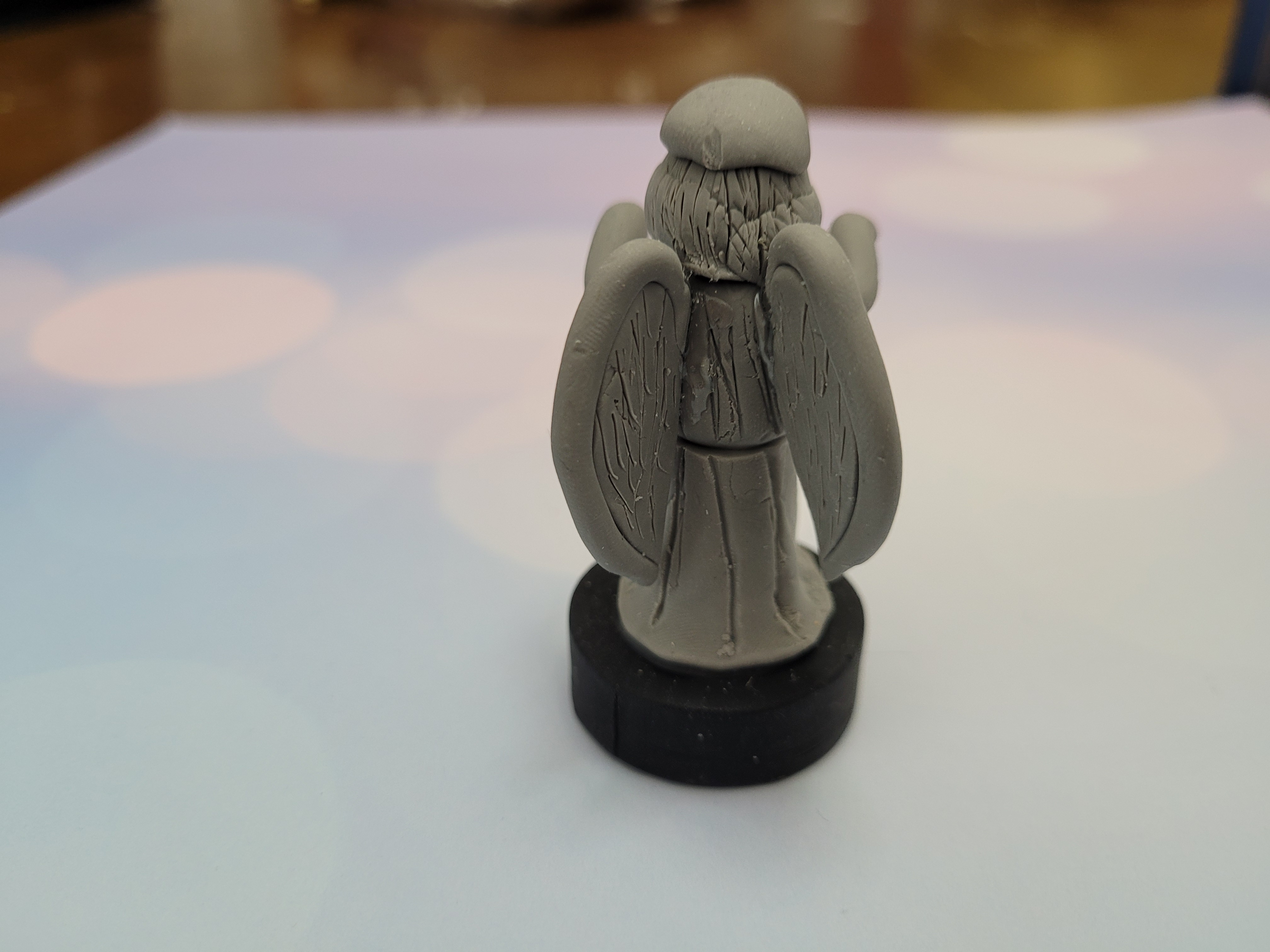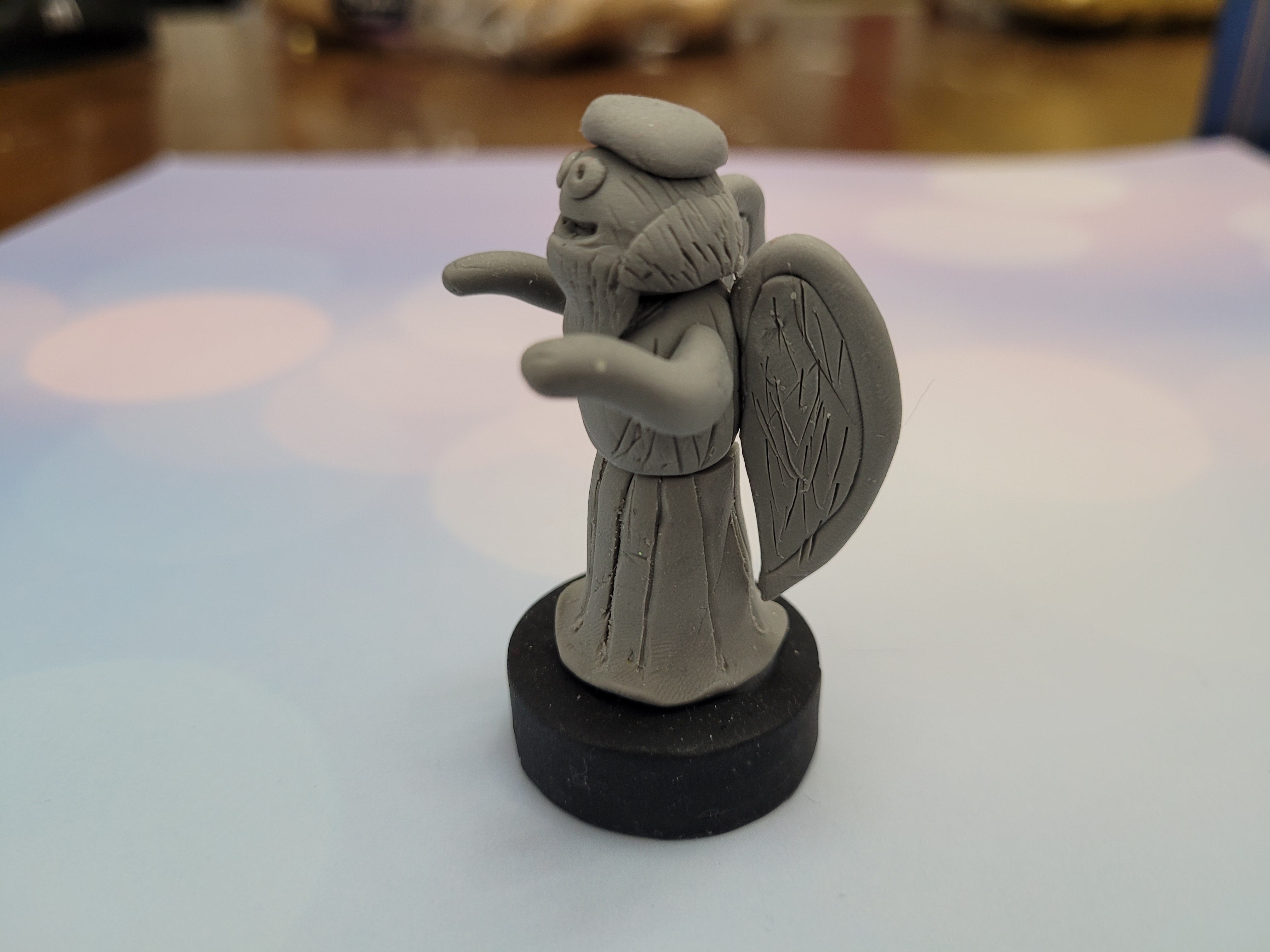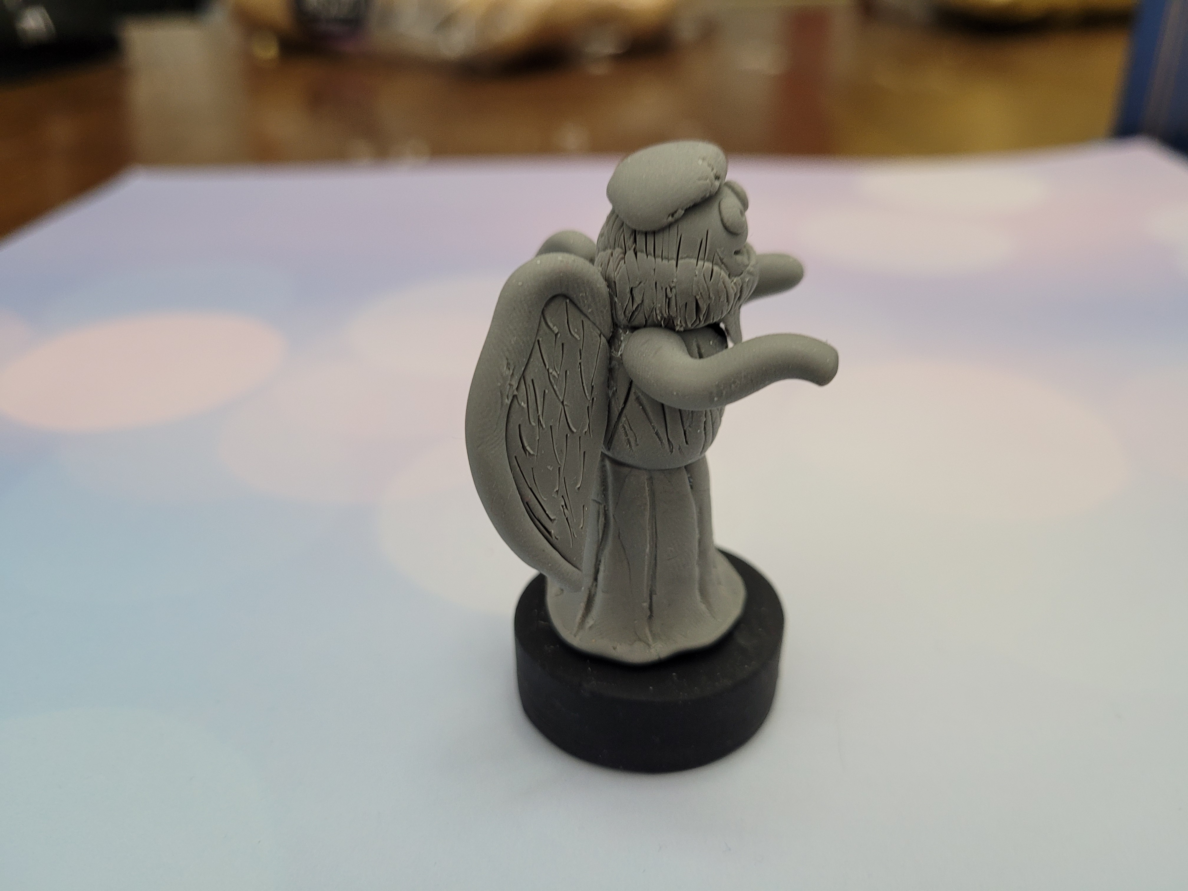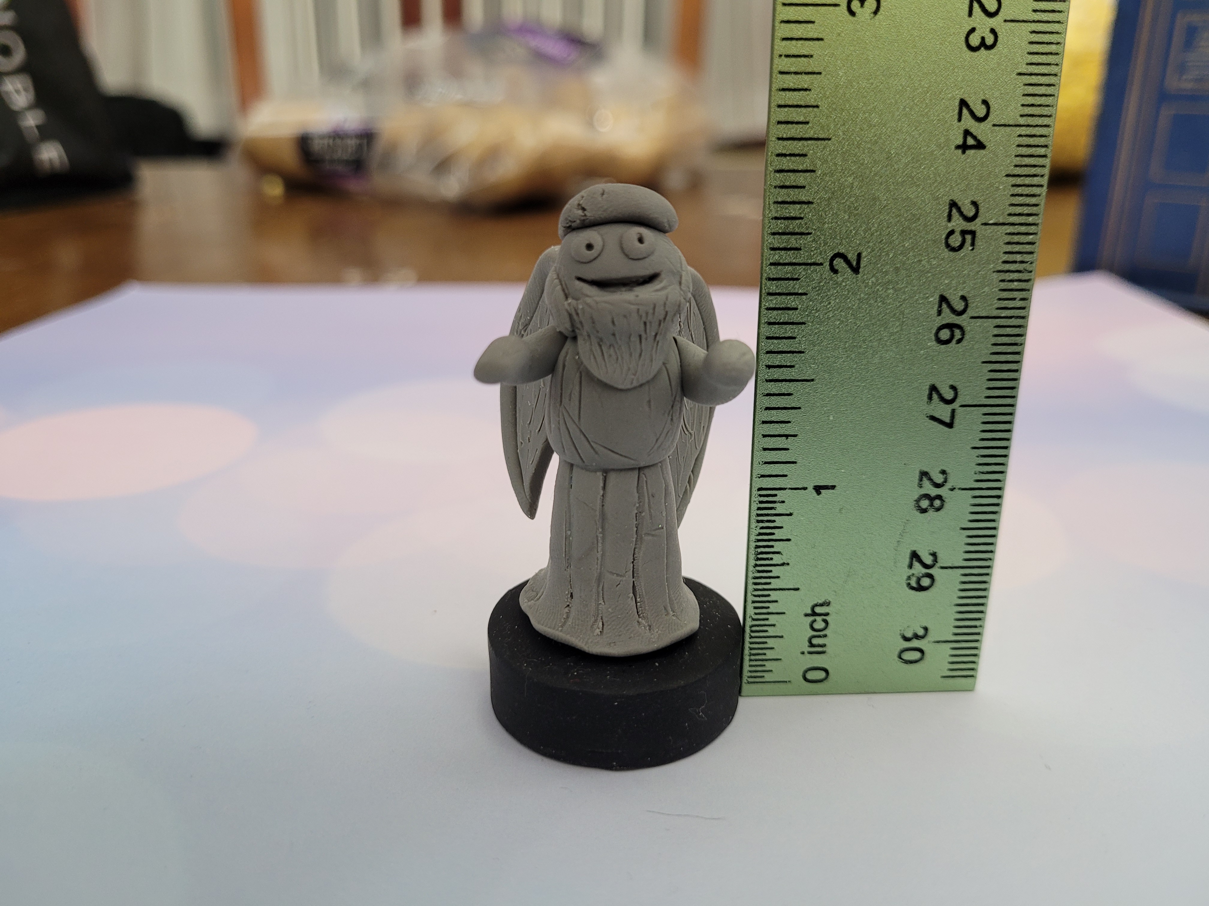 The Angel has the Phone box! Inspired by a friend, this is a Mashup figure of Gritty as a Weeping Angel. Made out 9f polymer clay, it measures 2 1/2 inches(6.3cm) from hockey puck base to top of hat, and the base is 1 1/8 inches(3.1cm) in diameter.