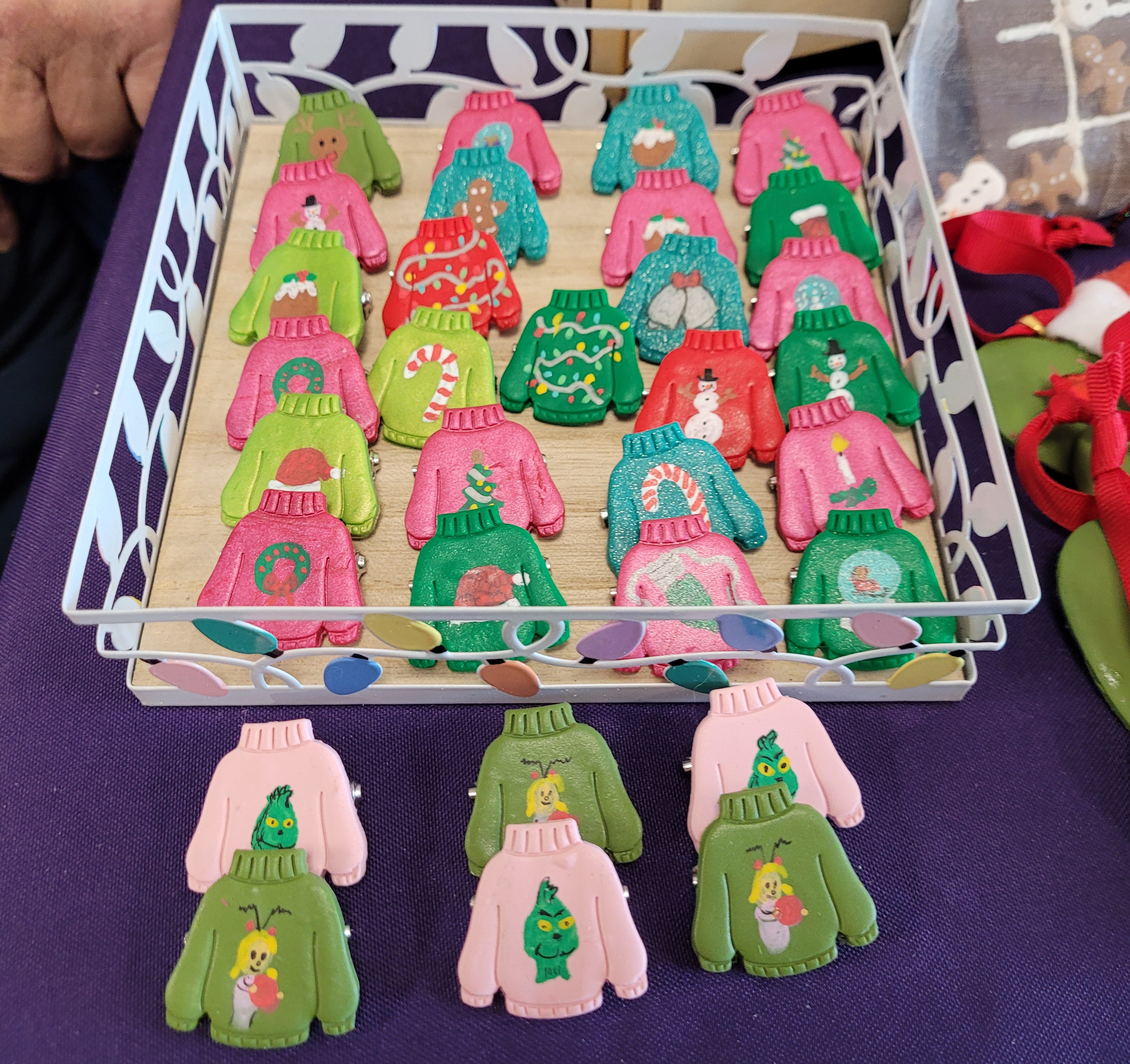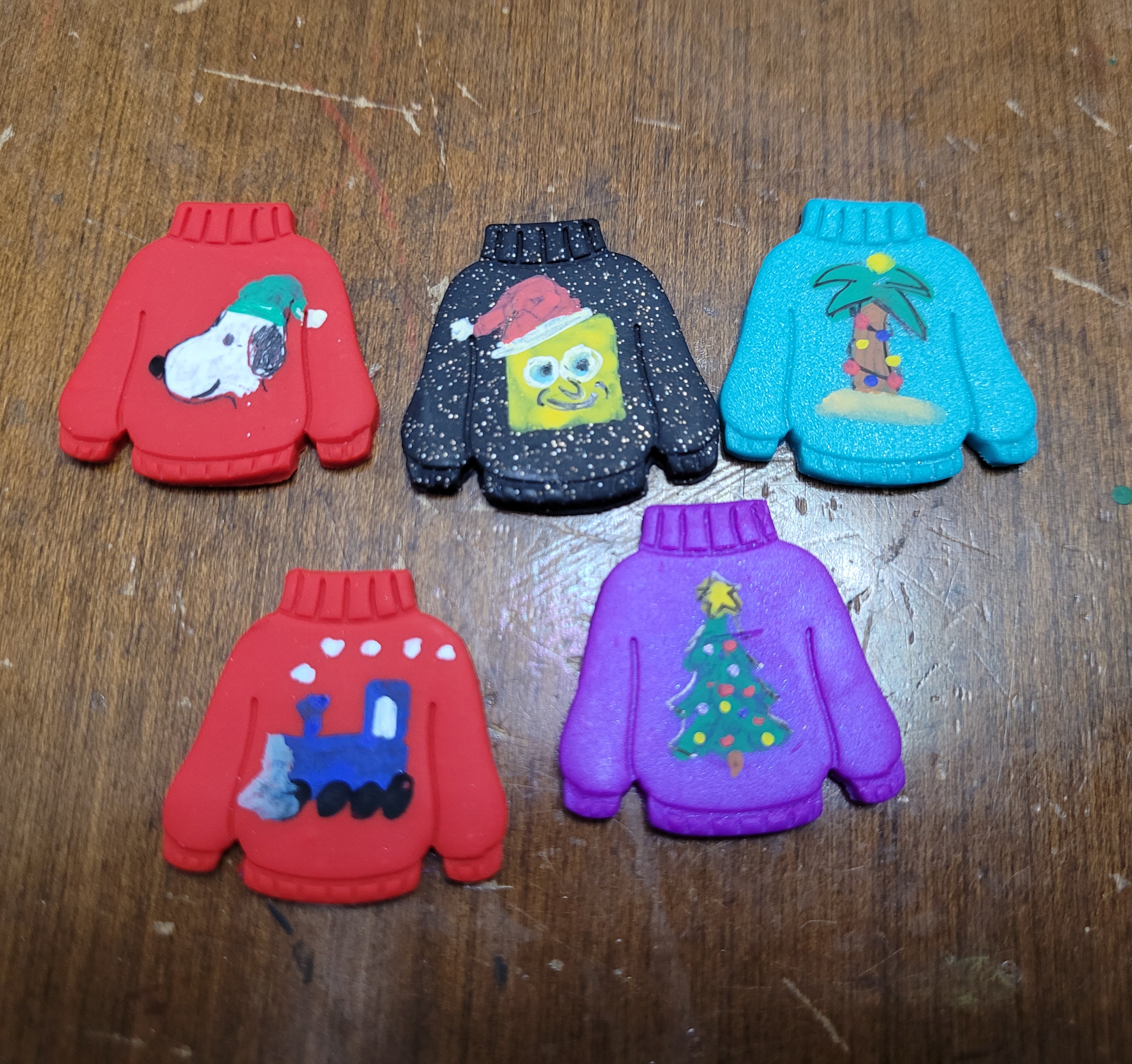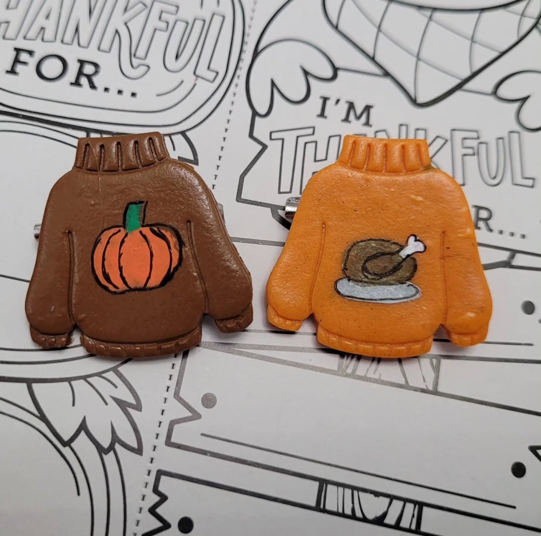 Made to order polymer clay ugly sweater pins mesuring 1.25 inches tall. I have nearly every color of Sculpey 3 and premo available currently, so just name your color and what you want painted on it, and I'll made it for you. Depending on the complexity and to allow time for drying of the paint, sealer, and glue for the pin backings, it will take 3-4 days to make the pin, and then ship it to you through USPS. Since it's a cutter and hand painted, I can paint multiple pins in one go, so there's no extra wait if you want more than one pin.