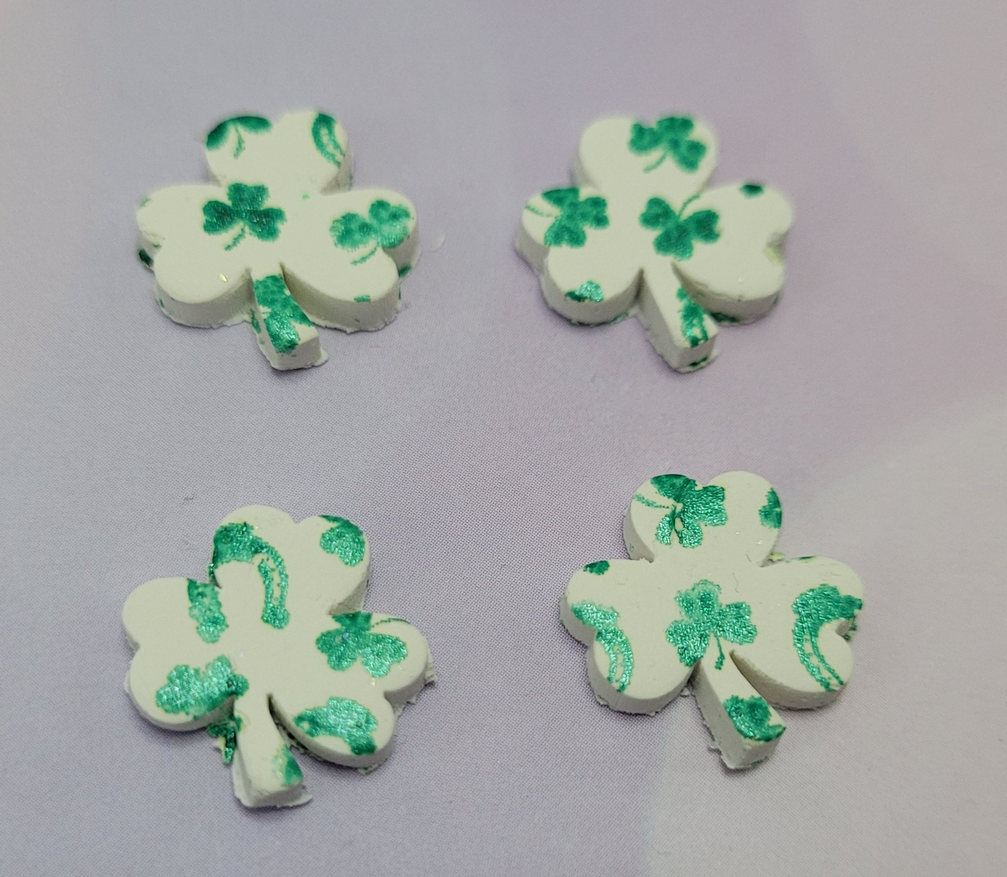 Be festive with a cute pair of tiny shamrock earrings. Slightly made to order, when checking out let me know in the notes whether you want them to be clip-ons or studs, I'll attach the correct nickel-free findings and have them shipped within 48 hours. Made with glitter polymer clay, acrylic paint, and sealed with acrylic sealant.