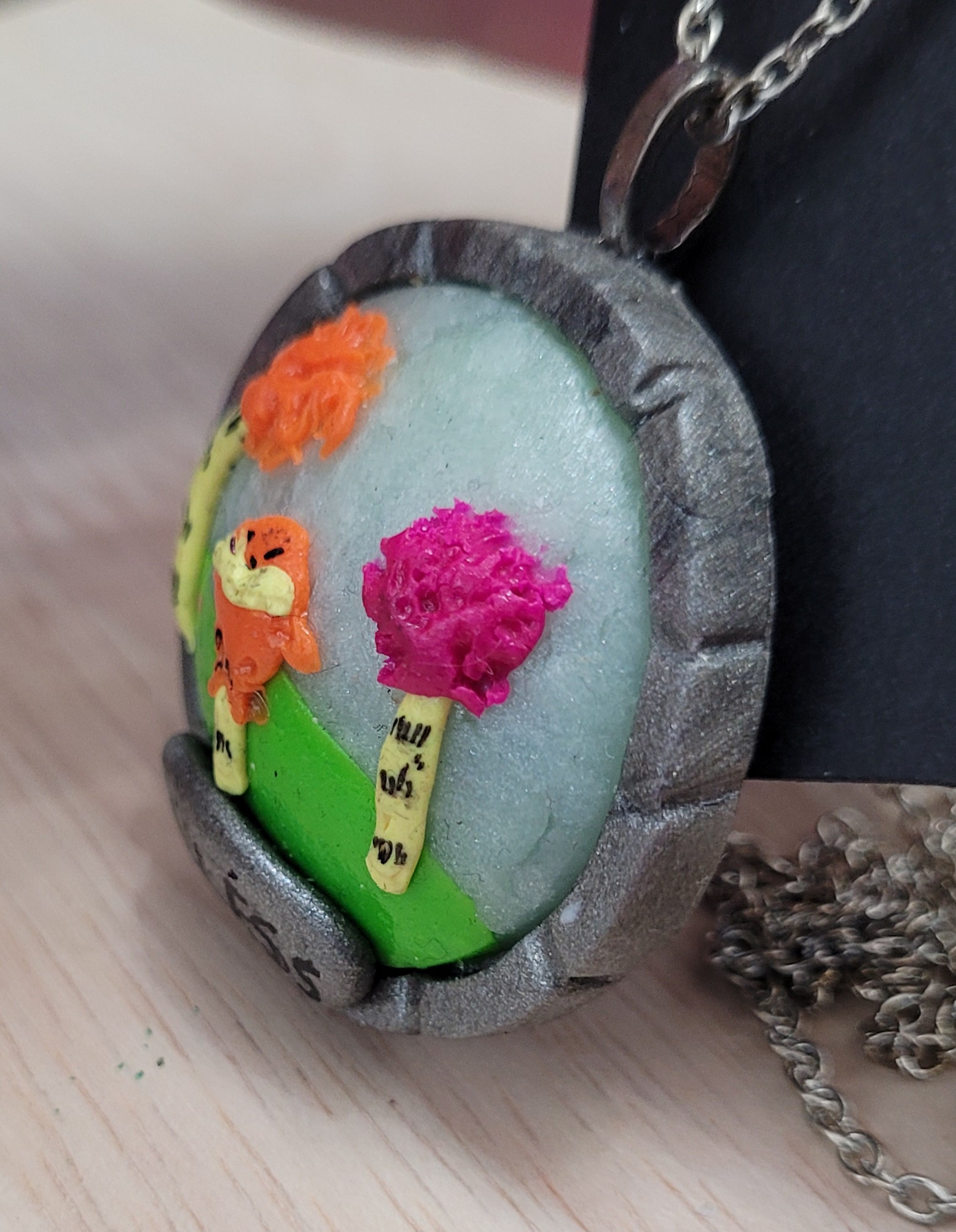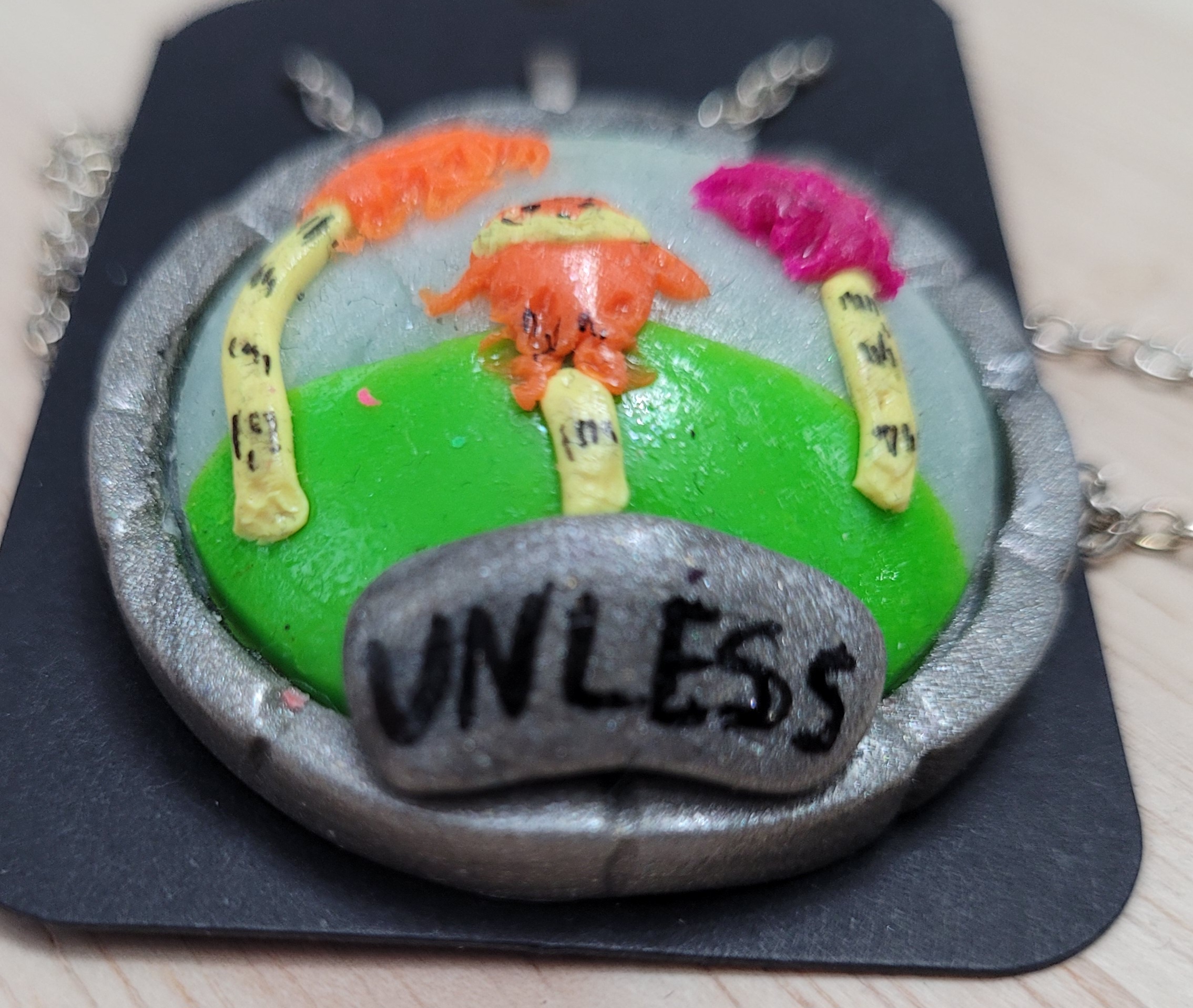 The Lorax is my favorite Dr. Seuss book, and I was inspired to make this necklace inspired by several scenes in the book. Handmade with Polymer clay, acrylic paint, nickel free metal findings, and sealed with acrylic sealant. Pendant measures 1.5 inches tall, and chain is 24 inches long.