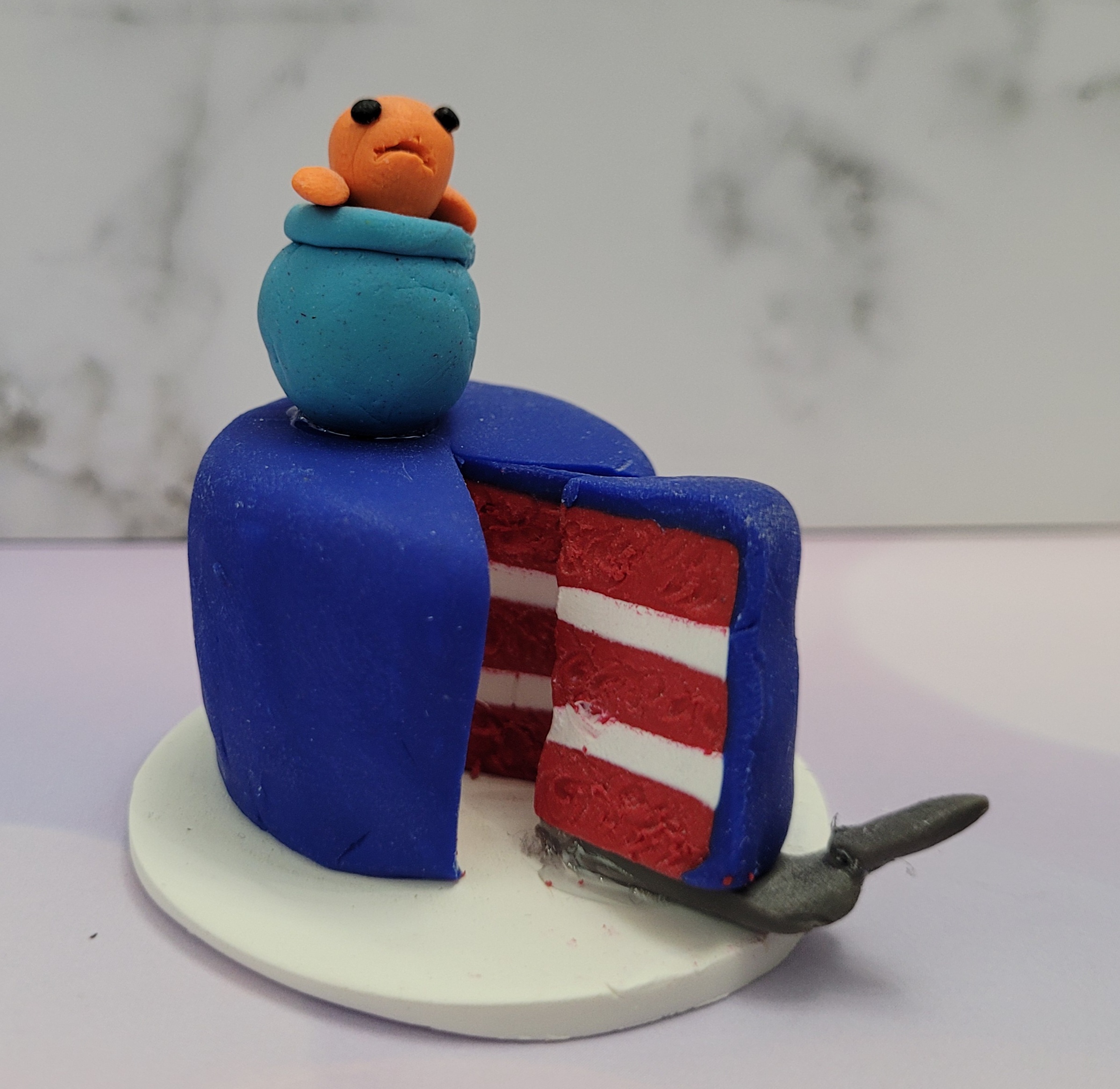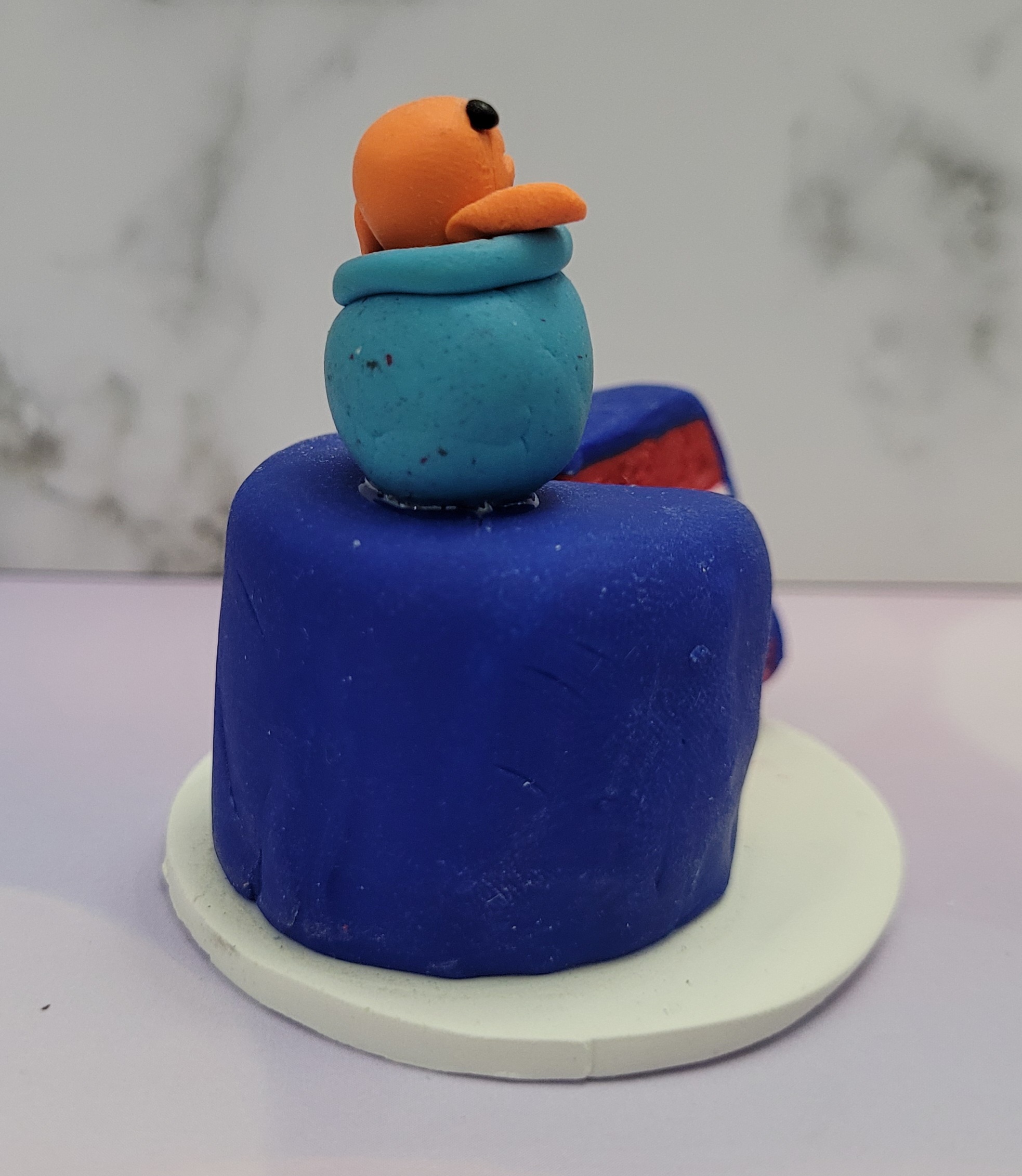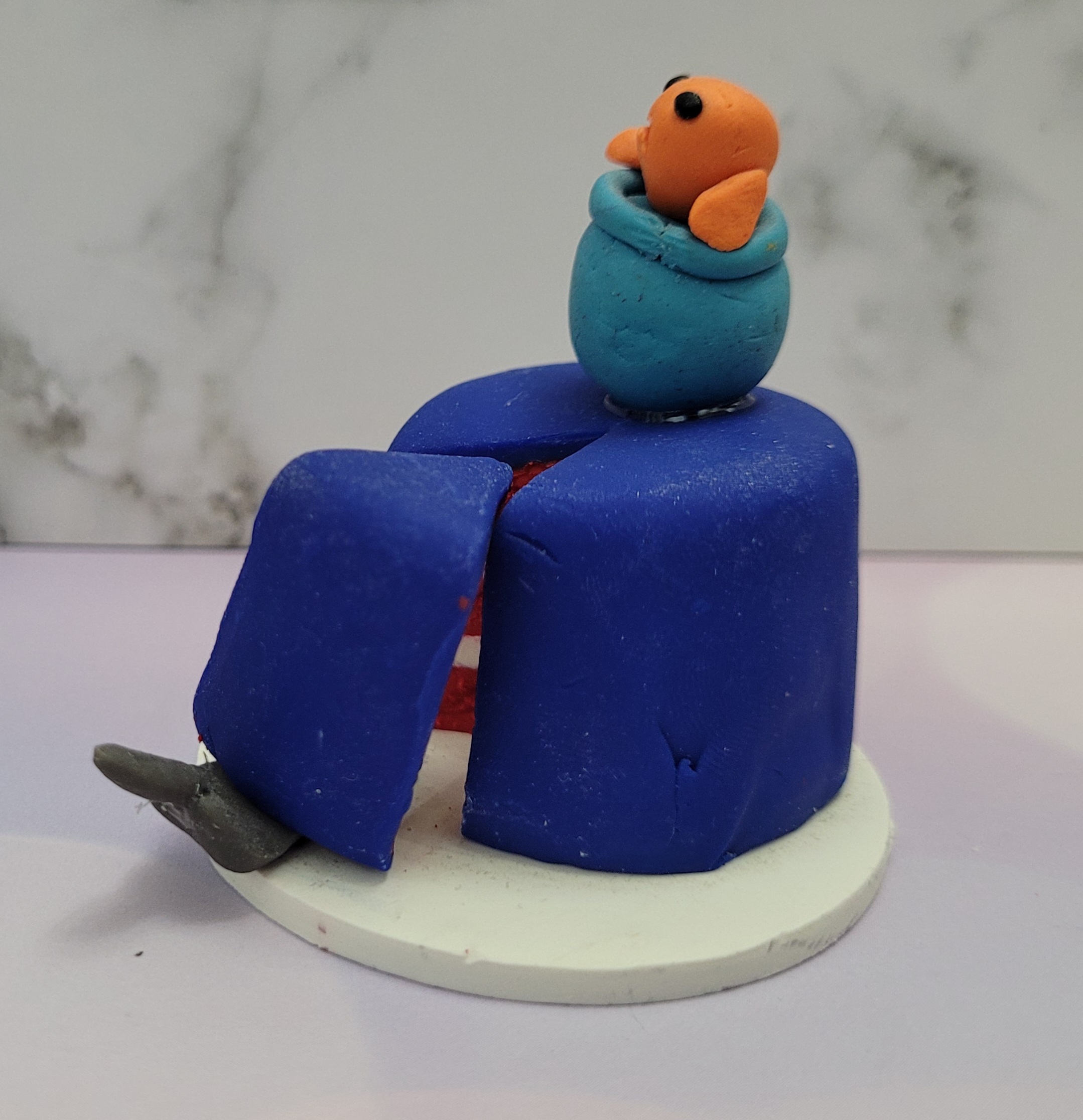 Cute little cake based after The Cat in the Hat by Dr. Seuss. Made with polymer clay and a bit of glue when the handle of the serving knife broke.
