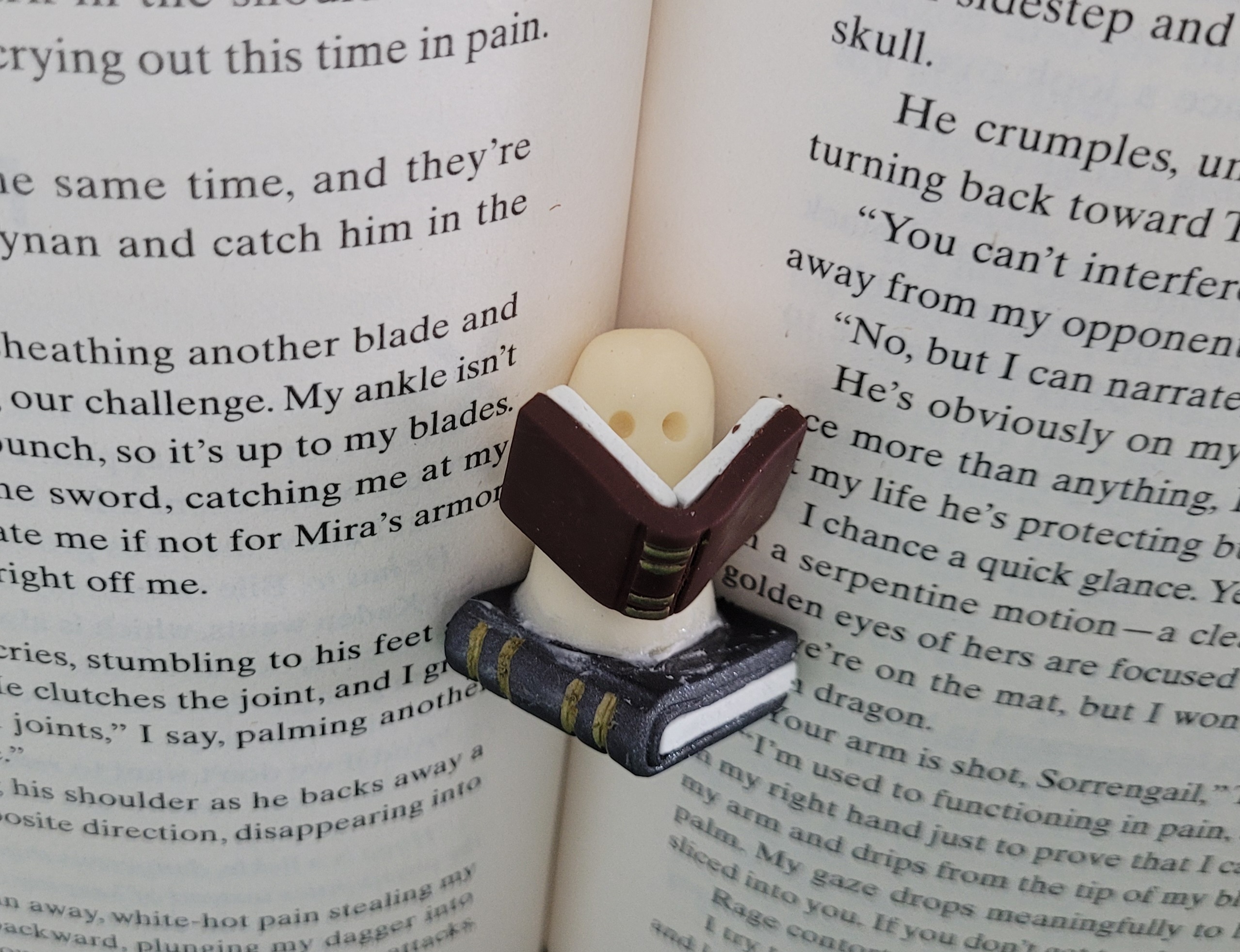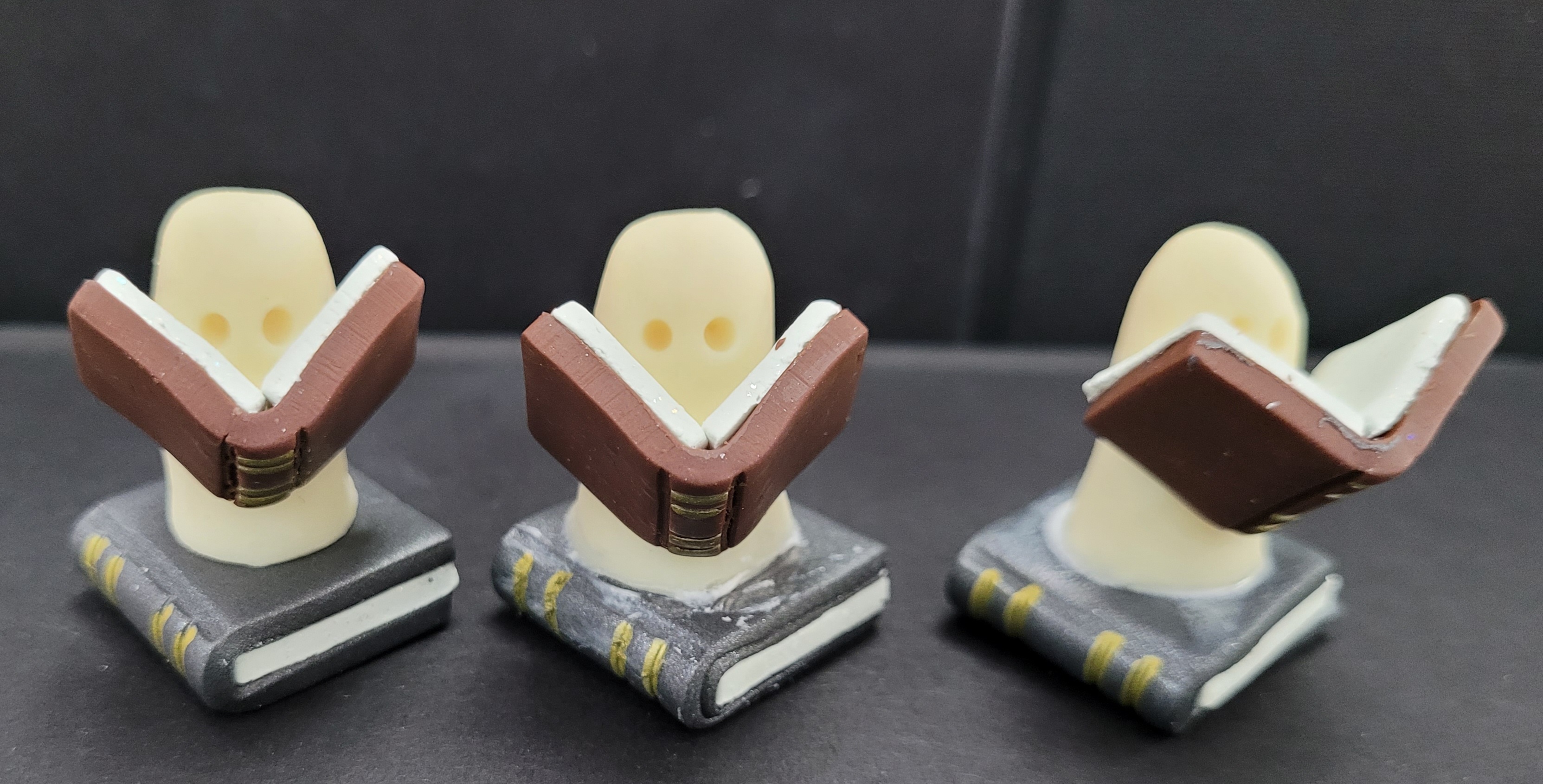 For you book lovers out there, I made some glow in the dark ghostie sculptures! Each one I'd reading a book on a book, great size to put on your bookshelves with all your books. Made with polymer clay and gold leafing pen.